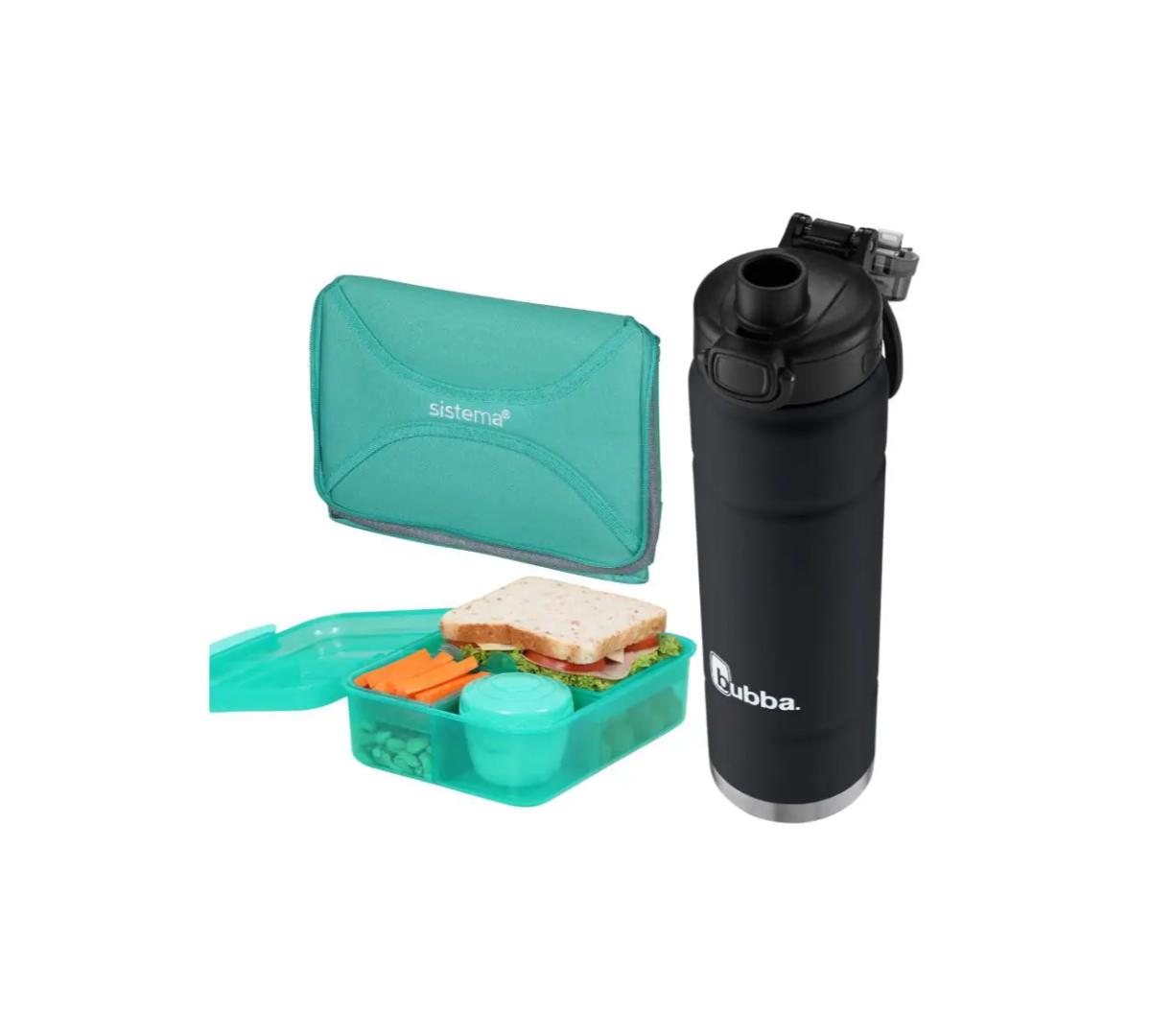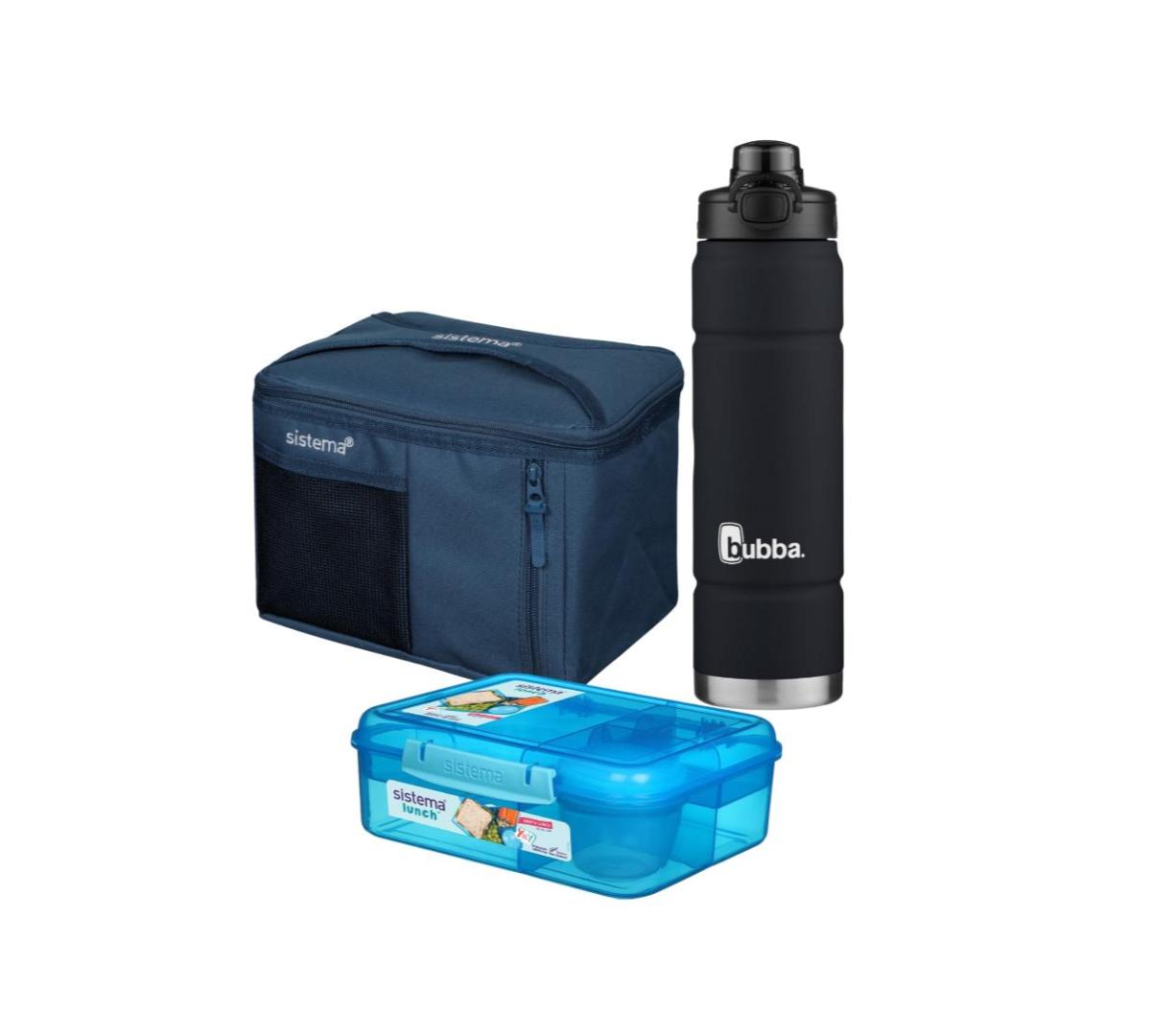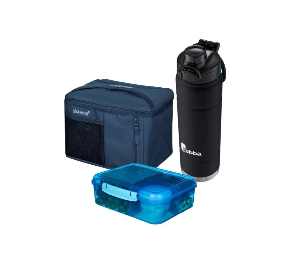 Incluye: Lunchera Bento Rectangular Sistema + Bolso Térmico Sistema Mega Fold up + Botella Térmica Bubba Trailblazer Pushbutton 709ml Licorice Mate