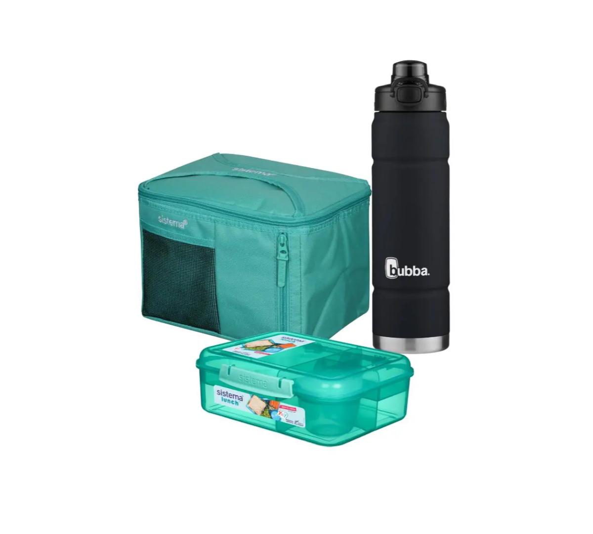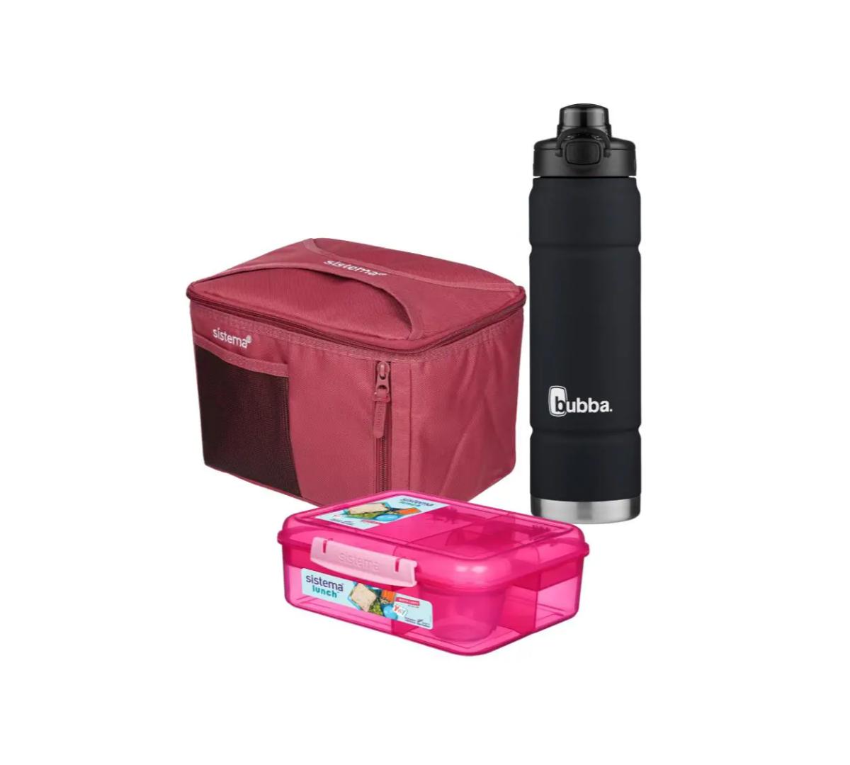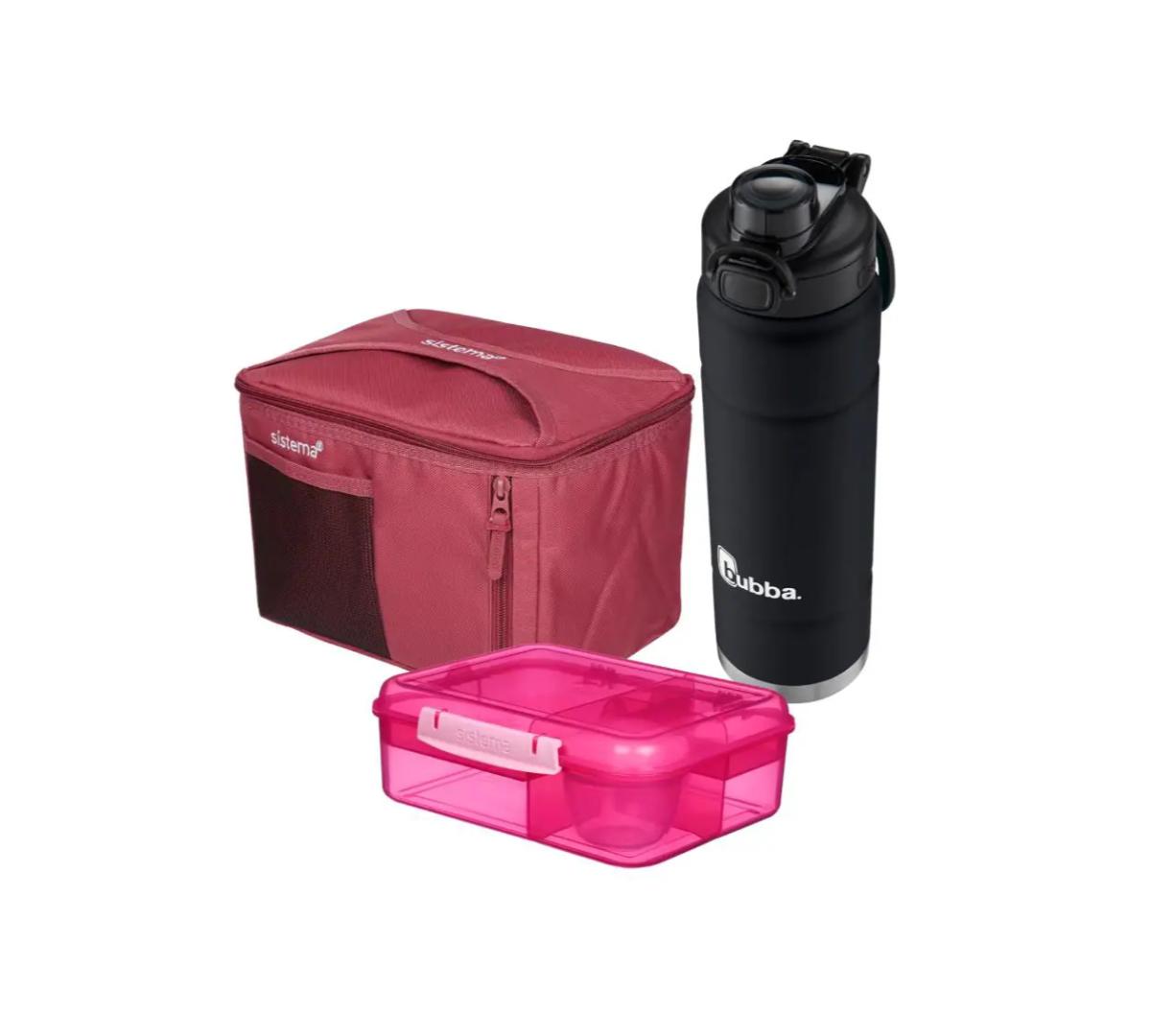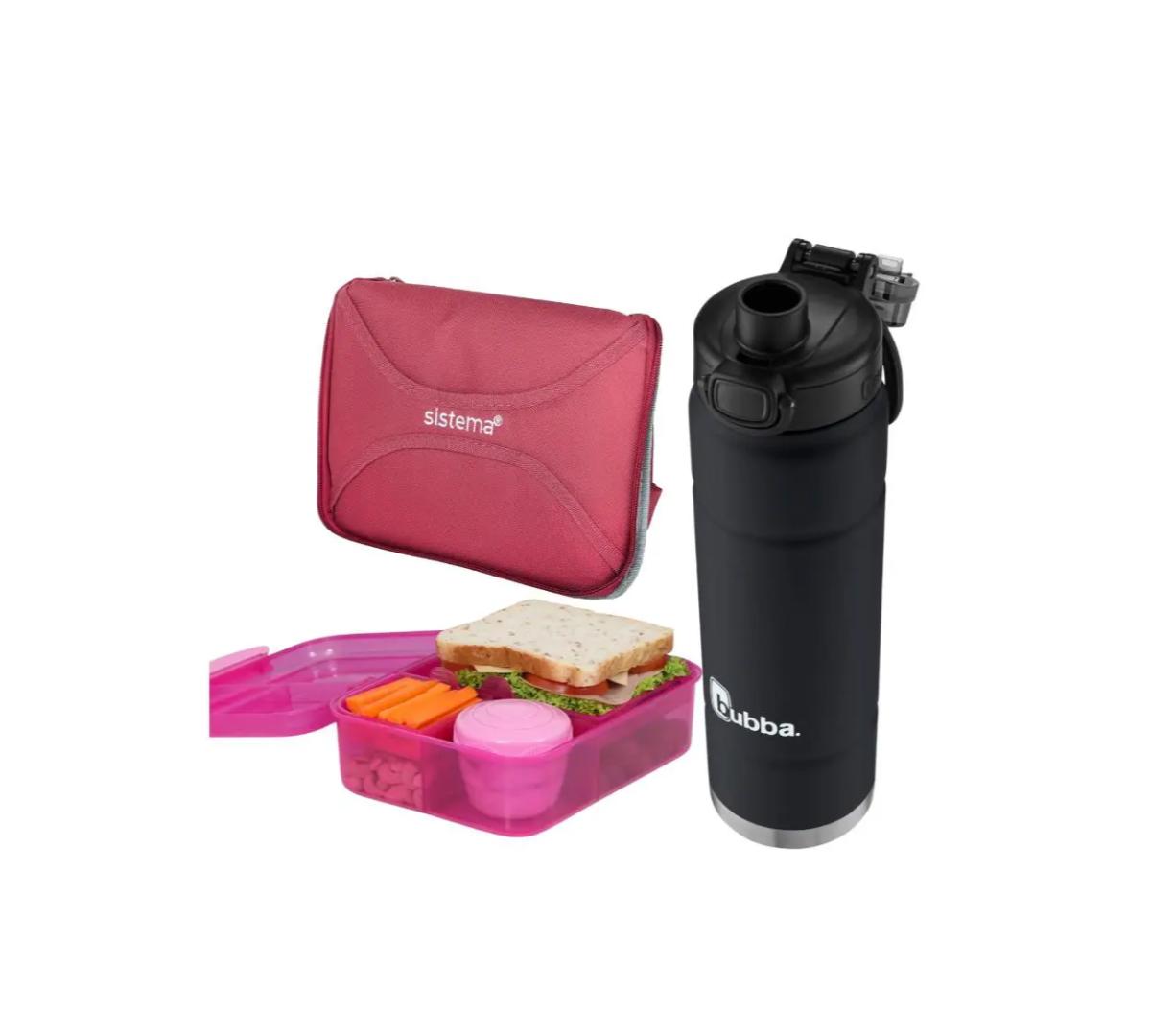 Incluye: Lunchera Bento Rectangular Sistema + Bolso Térmico Sistema Mega Fold up + Botella Térmica Bubba Trailblazer Pushbutton 709ml Licorice Mate