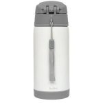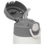 Mantiene las bebidas frias por 6hs y calientes por 4hs. Se puede utilizar para almacenar agua, zumos y tés. Fabricado en acero inoxidable de doble pared, es resistente e higiénico. Tiene una pajita de silicona y una tapa hermetica con boton de seguridad. Aro de transporte para que el niño/a pueda llevarlo a todas partes. Todas las piezas son libres de BPA.