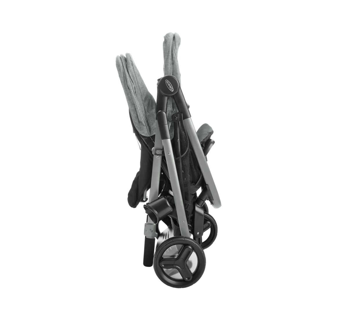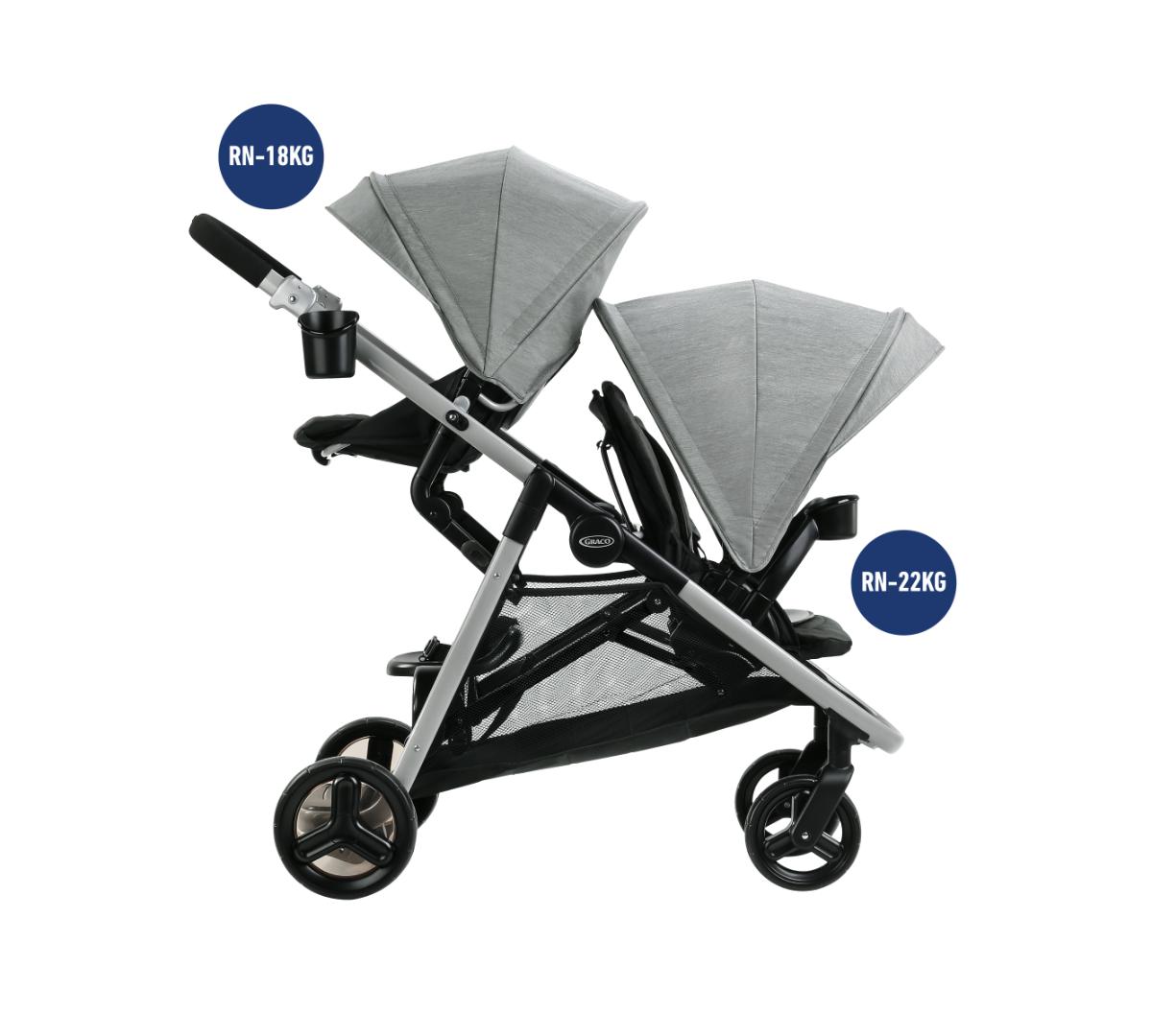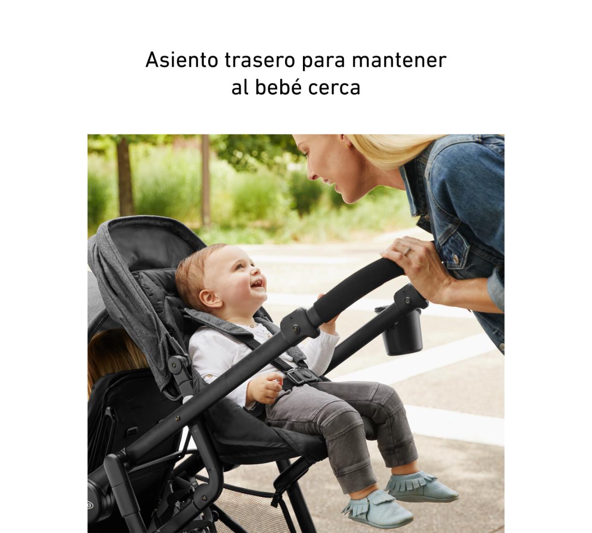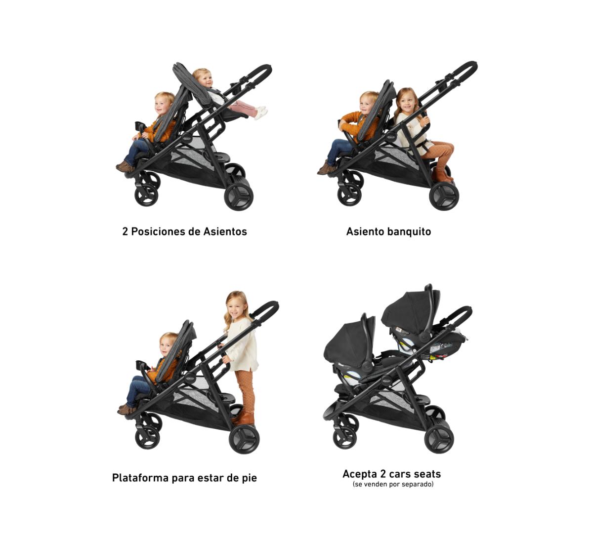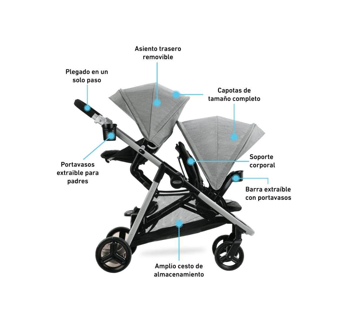 Se pliega fácilmente como un carrito simple pero funciona como doble. Incluye dos asientos individuales, Además, el asiento trasero se puede retirar y se convierte fácilmente en un asiento tipo banco o una plataforma para que tu hijo mayor viaje parado, además los dos asientos aceptan baby seats Graco al mismo tiempo, perfecto si tenés mellizos o hijos con edades similares. El canasto inferior es grande y de fácil acceso, ideal para llevar mudas, pañales y todo lo que necesites. Tiene además posavasos tanto para mamá como para el niño, barras de apoyo desmontables para mayor comodidad y ambos asientos traen amplias capotas.