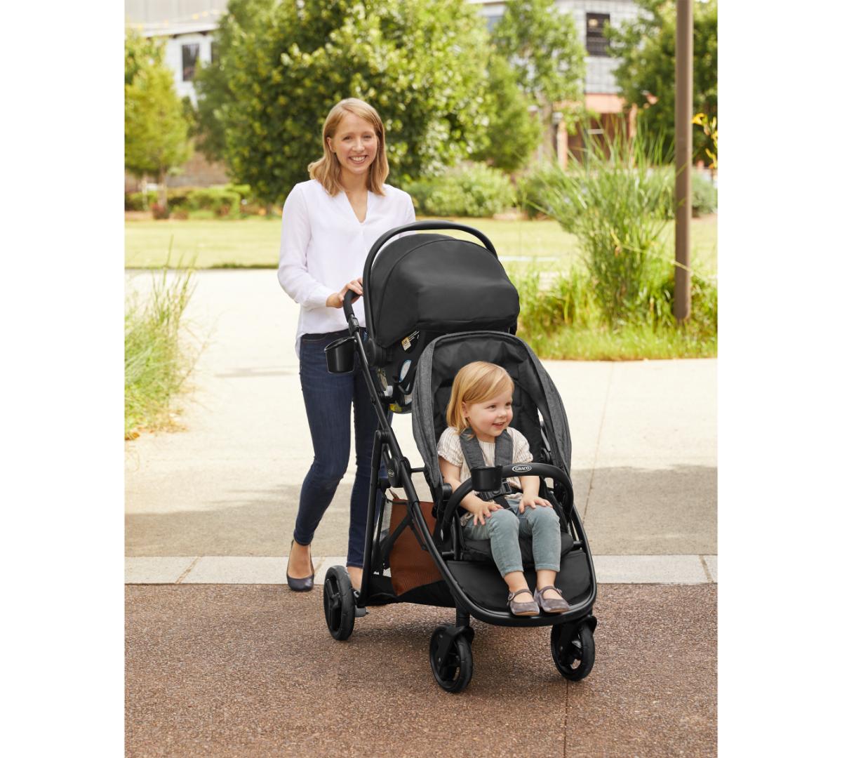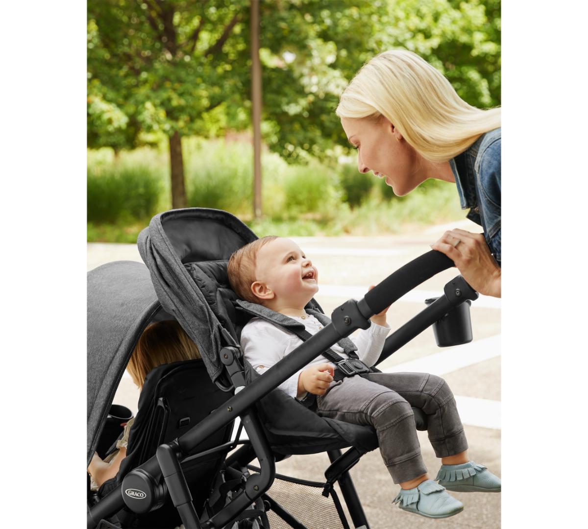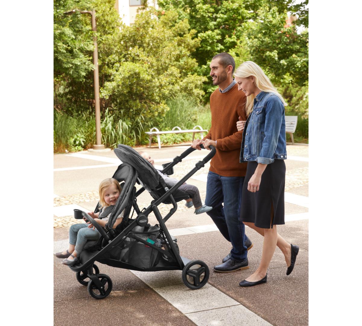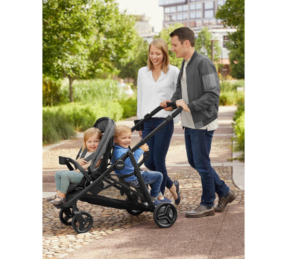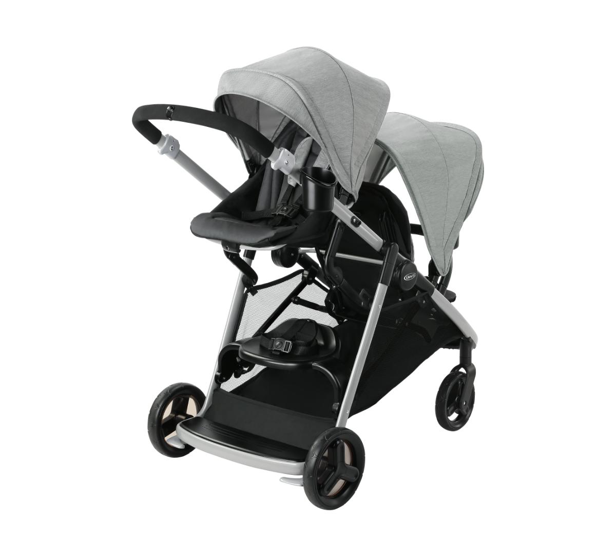 Se pliega fácilmente como un carrito simple pero funciona como doble. Incluye dos asientos individuales, Además, el asiento trasero se puede retirar y se convierte fácilmente en un asiento tipo banco o una plataforma para que tu hijo mayor viaje parado, además los dos asientos aceptan baby seats Graco al mismo tiempo, perfecto si tenés mellizos o hijos con edades similares. El canasto inferior es grande y de fácil acceso, ideal para llevar mudas, pañales y todo lo que necesites. Tiene además posavasos tanto para mamá como para el niño, barras de apoyo desmontables para mayor comodidad y ambos asientos traen amplias capotas.