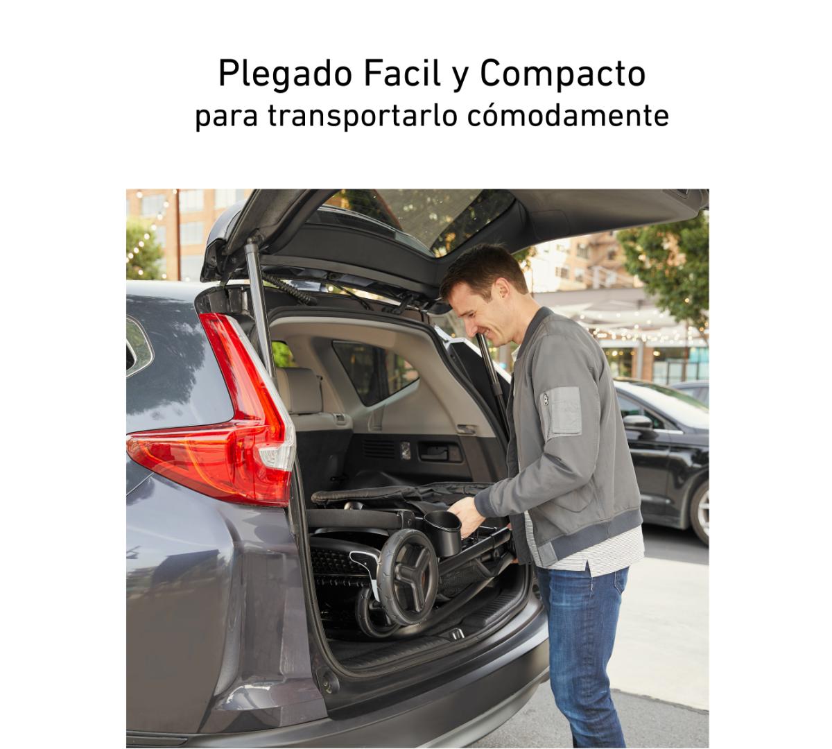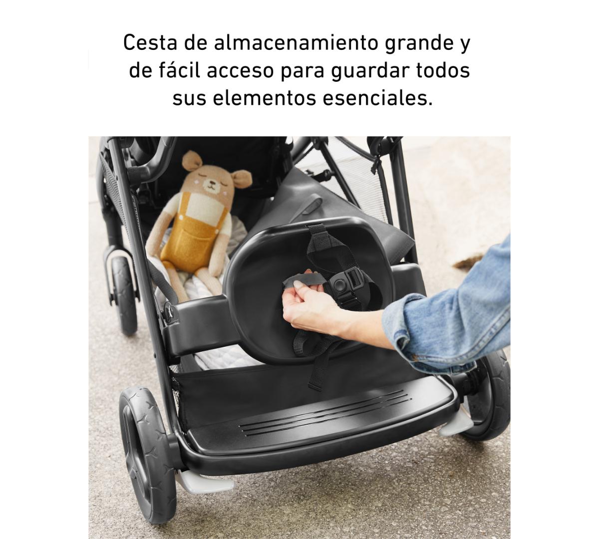 Se pliega fácil con una sola mano y queda erguido de forma independiente. Con soporte acolchado, arneses ajustables de 3 o 5 puntos para crecer con los chicos, y asientos reclinables, brinda seguridad y comodidad siempre. El asiento delantero aguanta hasta 22 kg y el trasero hasta 18 kg, así que te acompaña por varios años.