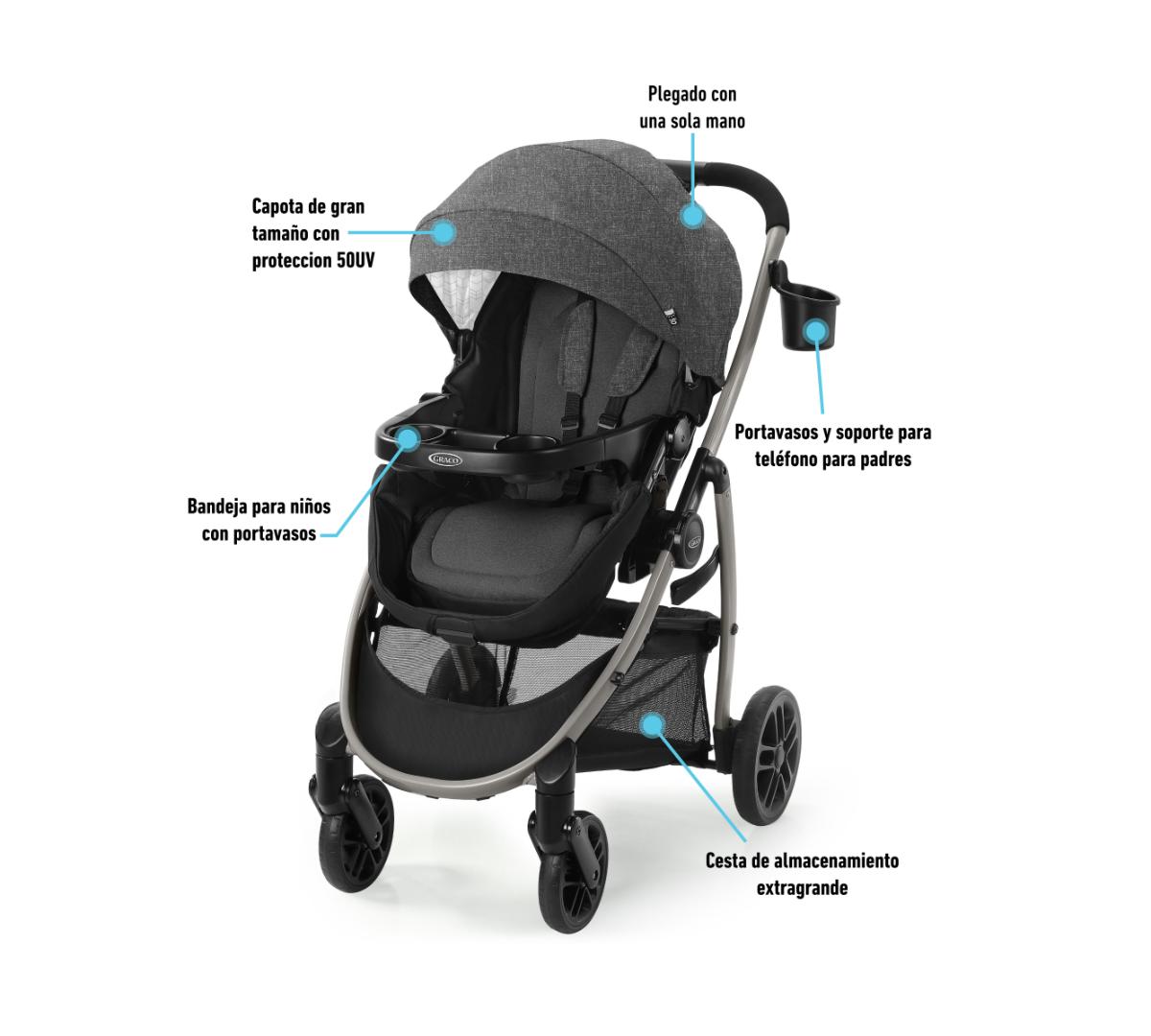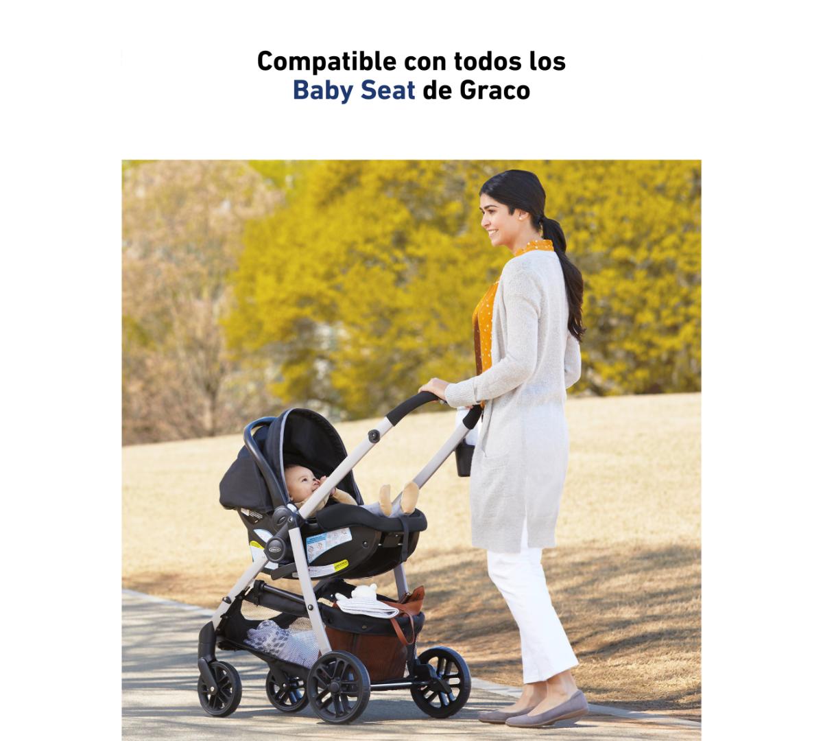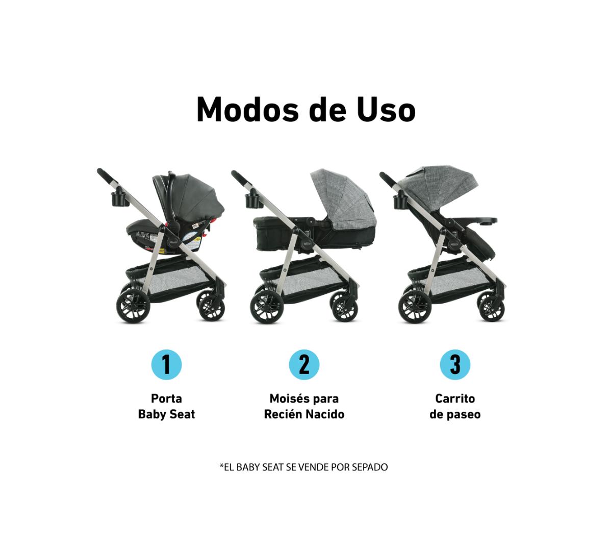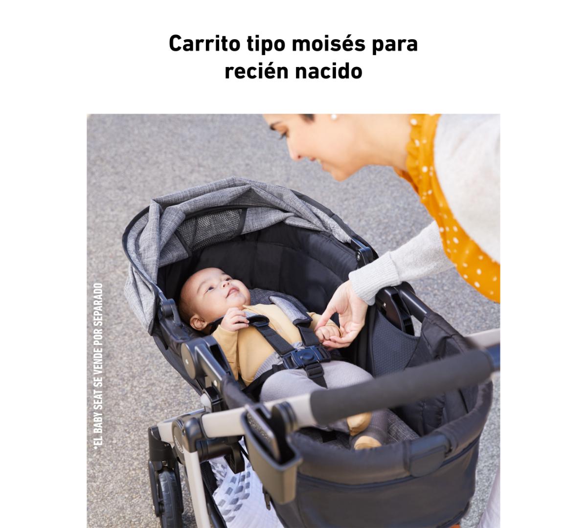 3 carritos en 1: carrito tipo moisés para recién nacido y carrito de paseo para niños pequeños y porta-baby seat (el baby seat se vende por separado). El asiento reversible del carrito puede mirar a los padres o al mundo, para brindar el paseo perfecto a medida que el bebé crece. El carrito es compatible todos los baby seats Graco, para una fácil transición del auto al carrito. Canasta de almacenamiento grande para artículos esenciales. Al plegarse se mantiene erguido en 1 solo paso para un fácil almacenamiento. La capota con ventana oculta mantiene a su hijo a la sombra y le permite controlarlo con facilidad. El asiento reclinable multiposición garantiza la comodidad del bebé.