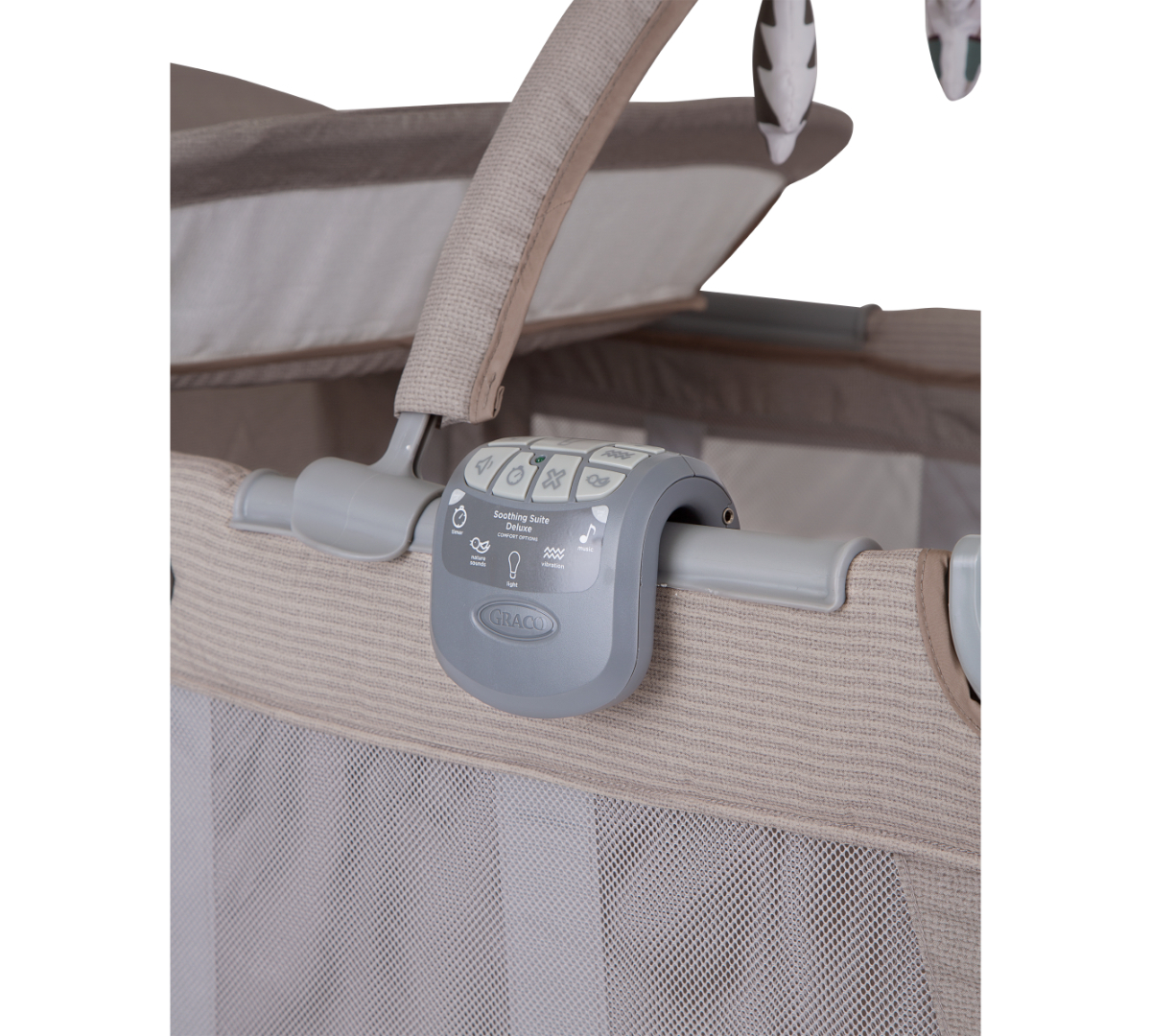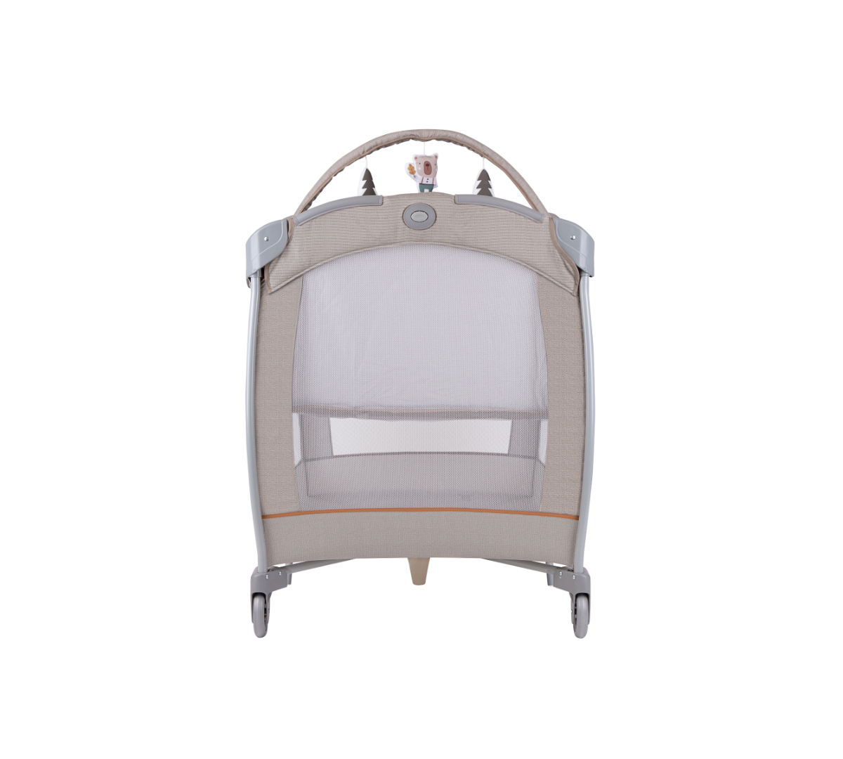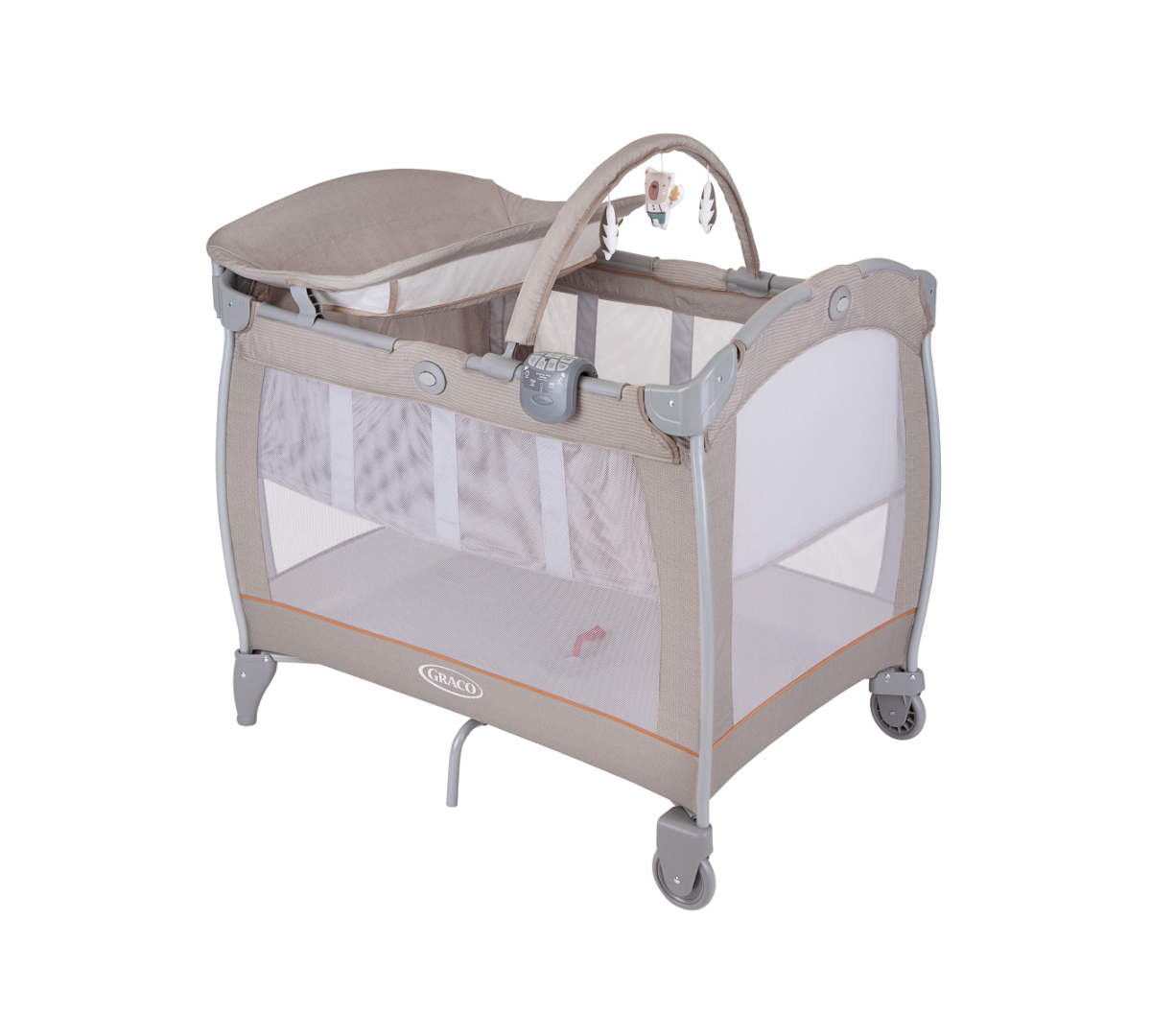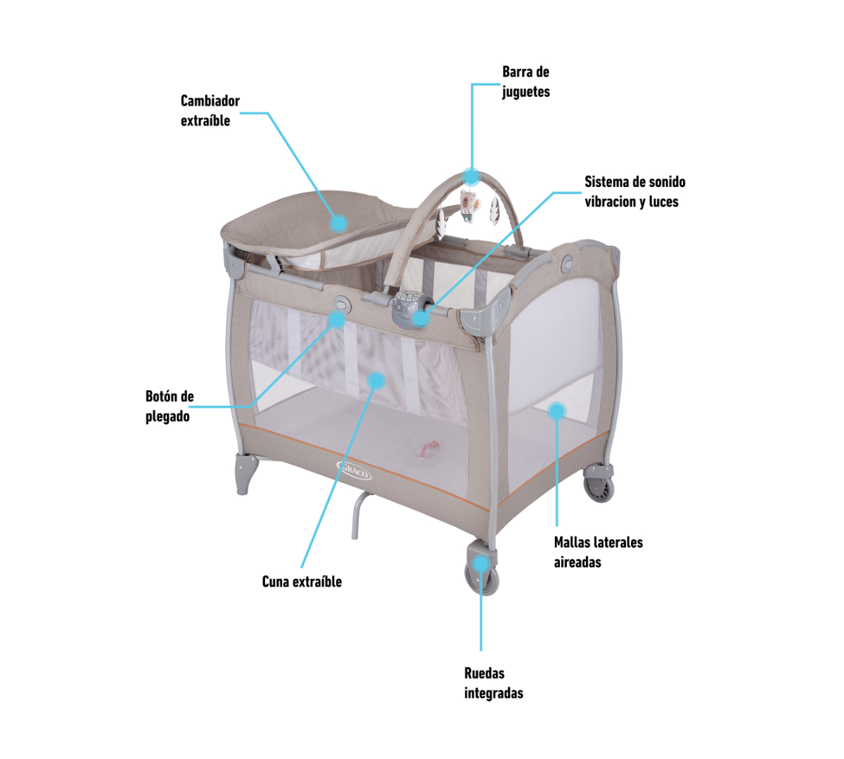 Gracias al sistema de plegado con botón Graco y sus 2 ruedas, se traslada y guarda fácilmente. Además, trae barra de juguetes y bolso de transporte para llevarlo a donde vayas.