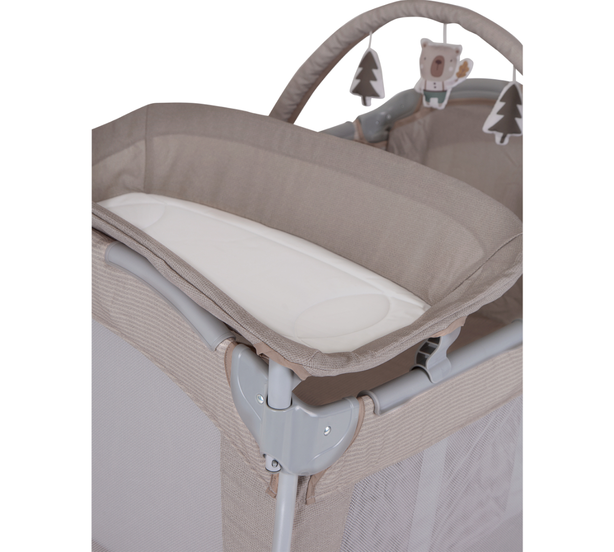 Es el corralito más completo para acompañarte desde el nacimiento. Incluye moisés desmontable para los primeros meses, cambiador con superficie fácil de limpiar y una unidad de control que ofrece música, vibración y luz nocturna para calmar al bebé. Su colchón firme y suave brinda un descanso cómodo, y los laterales de malla permiten vigilarlo desde cualquier ángulo.