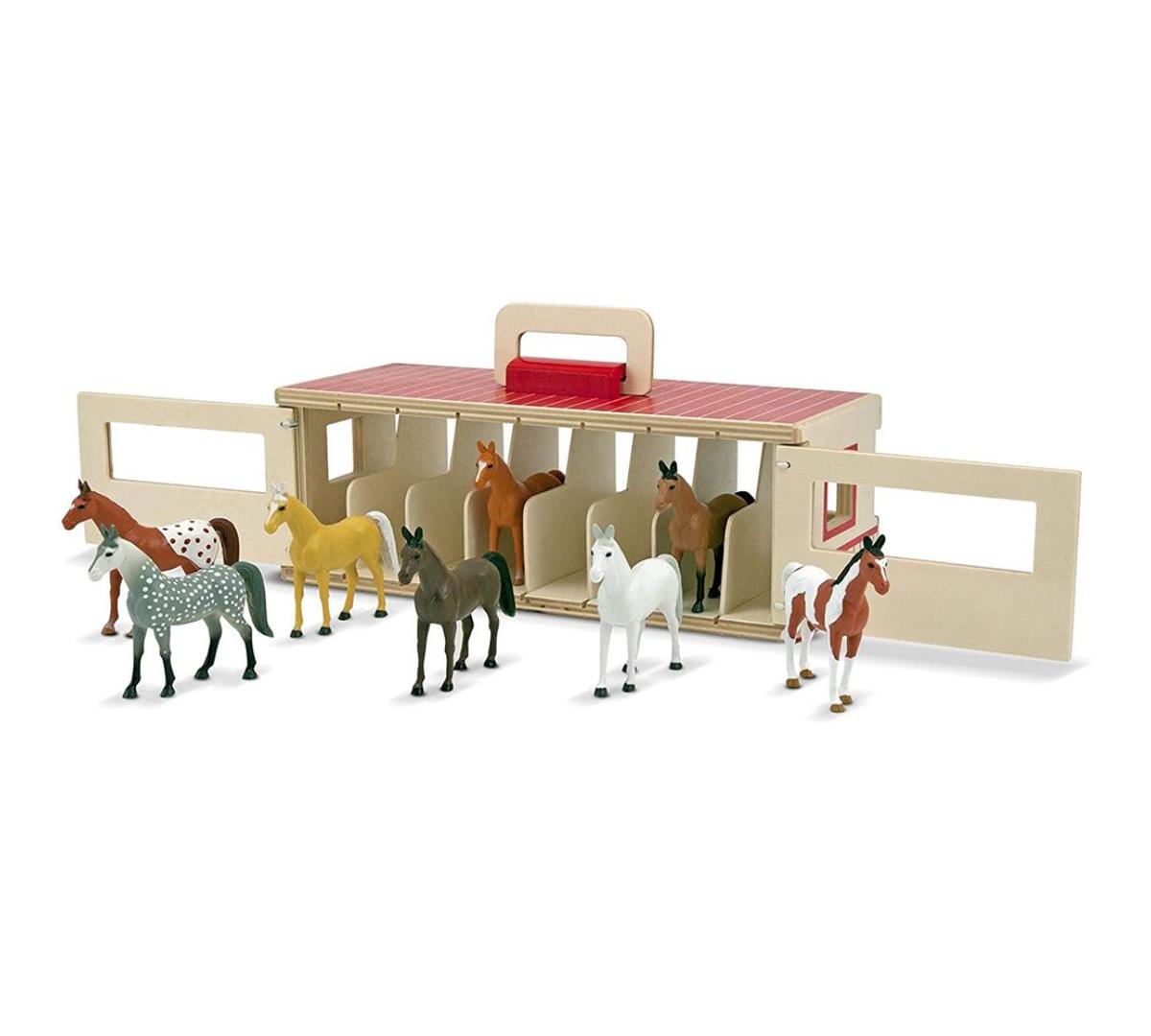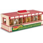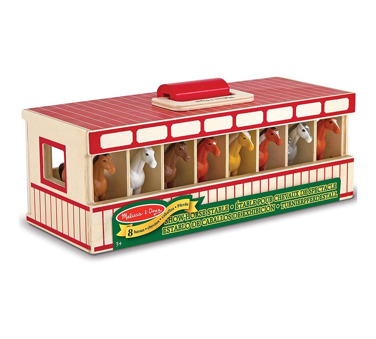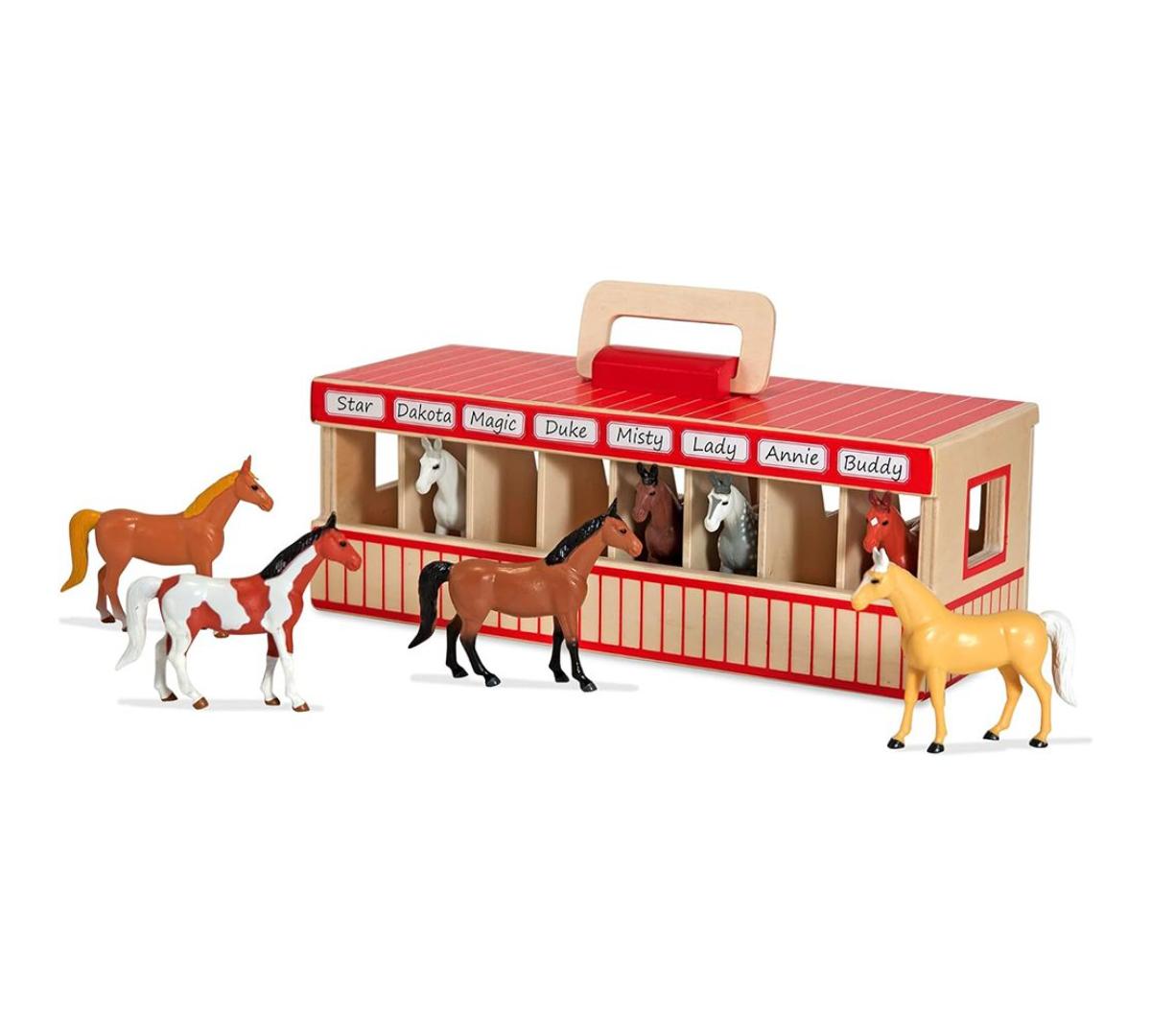 Abre las puertas del establo para sacarlos a jugar y luego vuelve a colocar cada uno en su establo hasta el próximo gran espectáculo ecuestre. La robusta caja de madera del establo cuenta con un cómodo asa en la parte superior, un pestillo metálico seguro para niños en las amplias puertas de madera y una guía de razas ilustrada en el panel inferior con información sobre cada caballo. ¡También incluye etiquetas para escribir para que los niños puedan nombrar cada caballo y etiquetar los puestos!