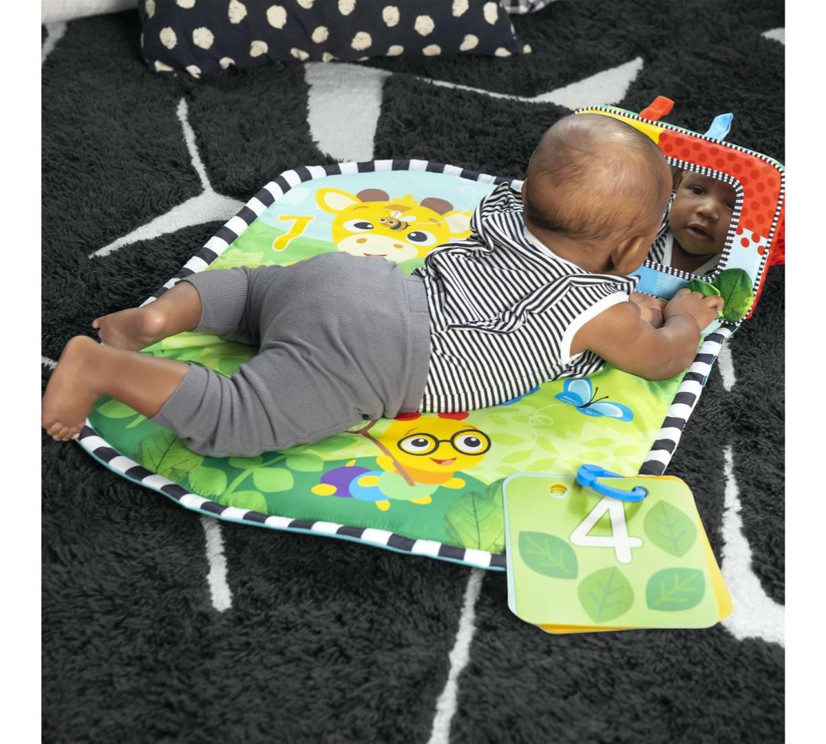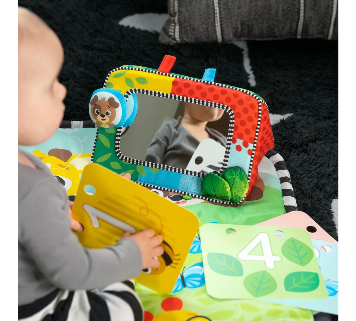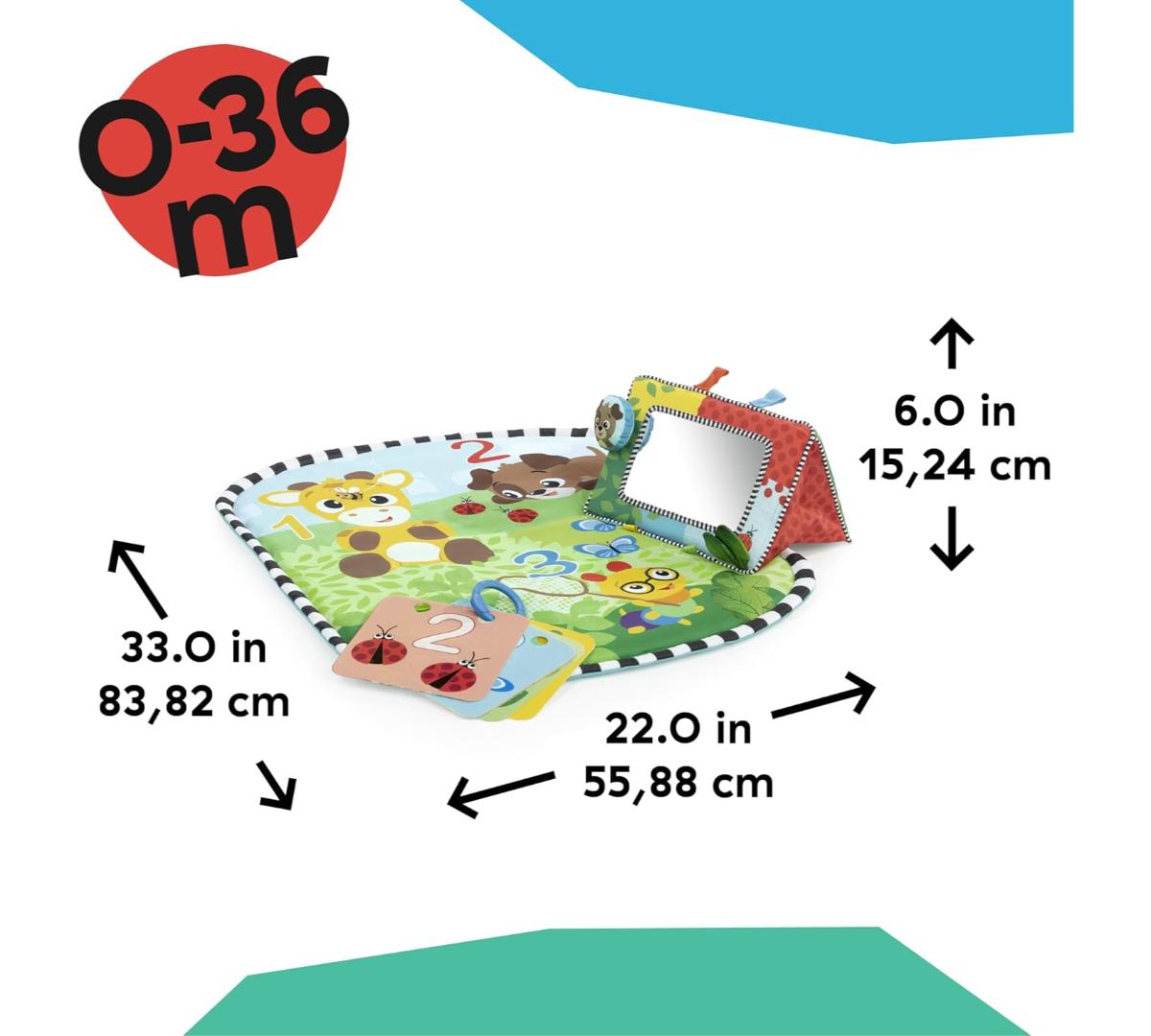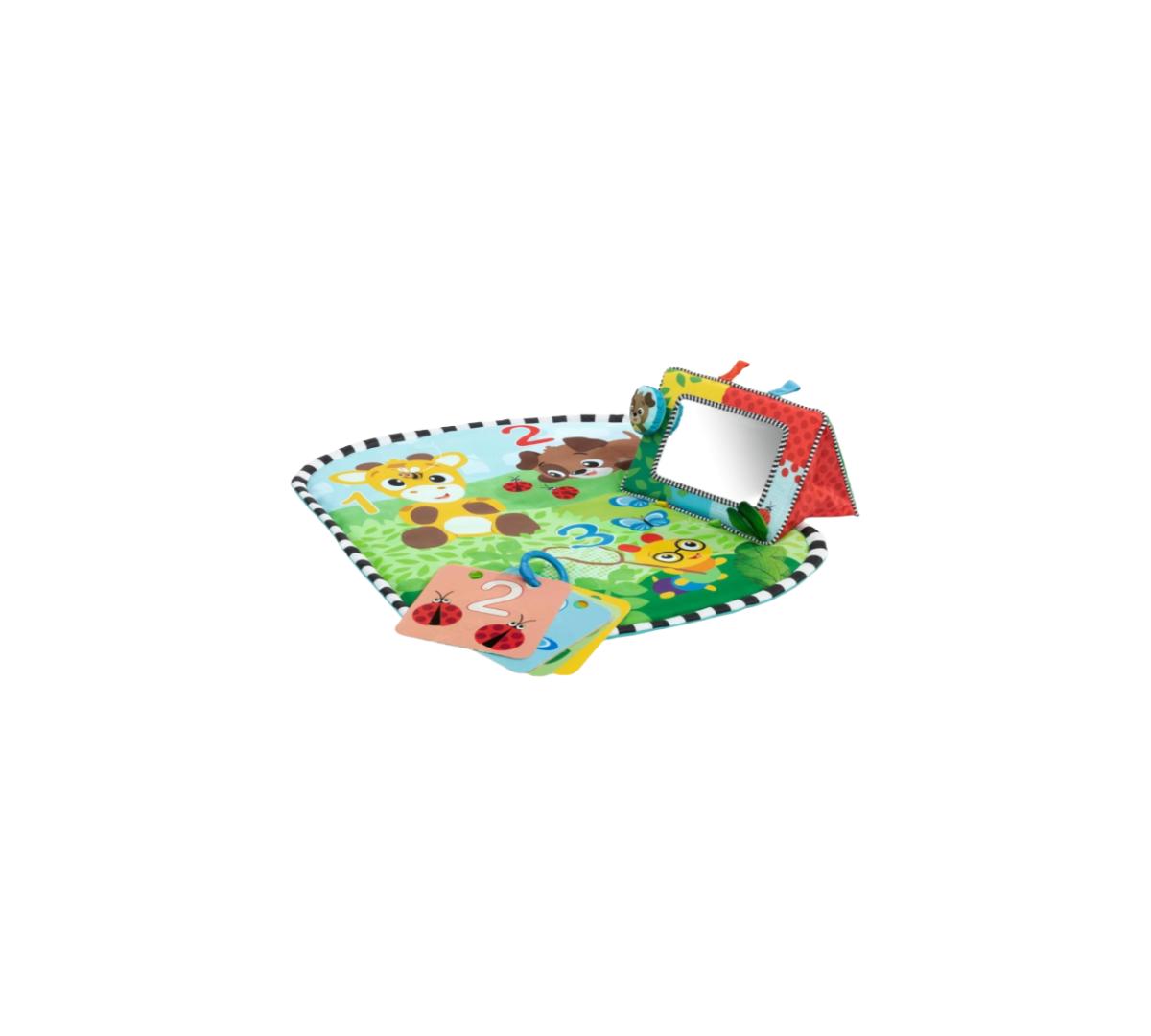 Explorá y aprendé en cualquier lugar con este set. Esta alfombra plegable ofrece 3 formas de juego: boca abajo, sentado o en movimiento. Incluye espejo seguro, texturas crujientes, chifle y colores vibrantes que estimulan los sentidos. Trae tarjetas educativas enlazables para aprender números, colores y animales.