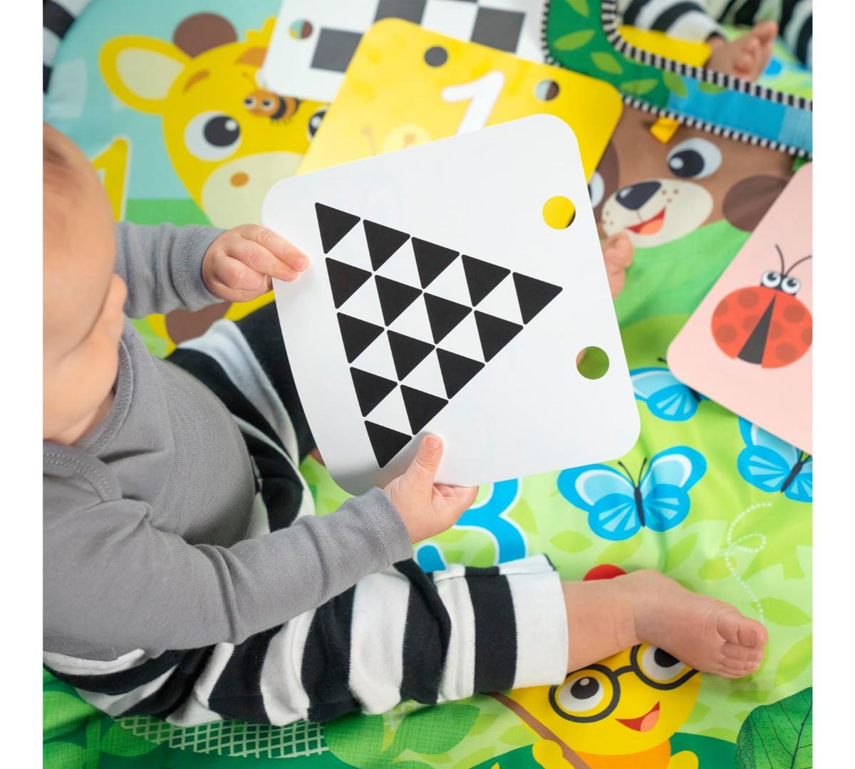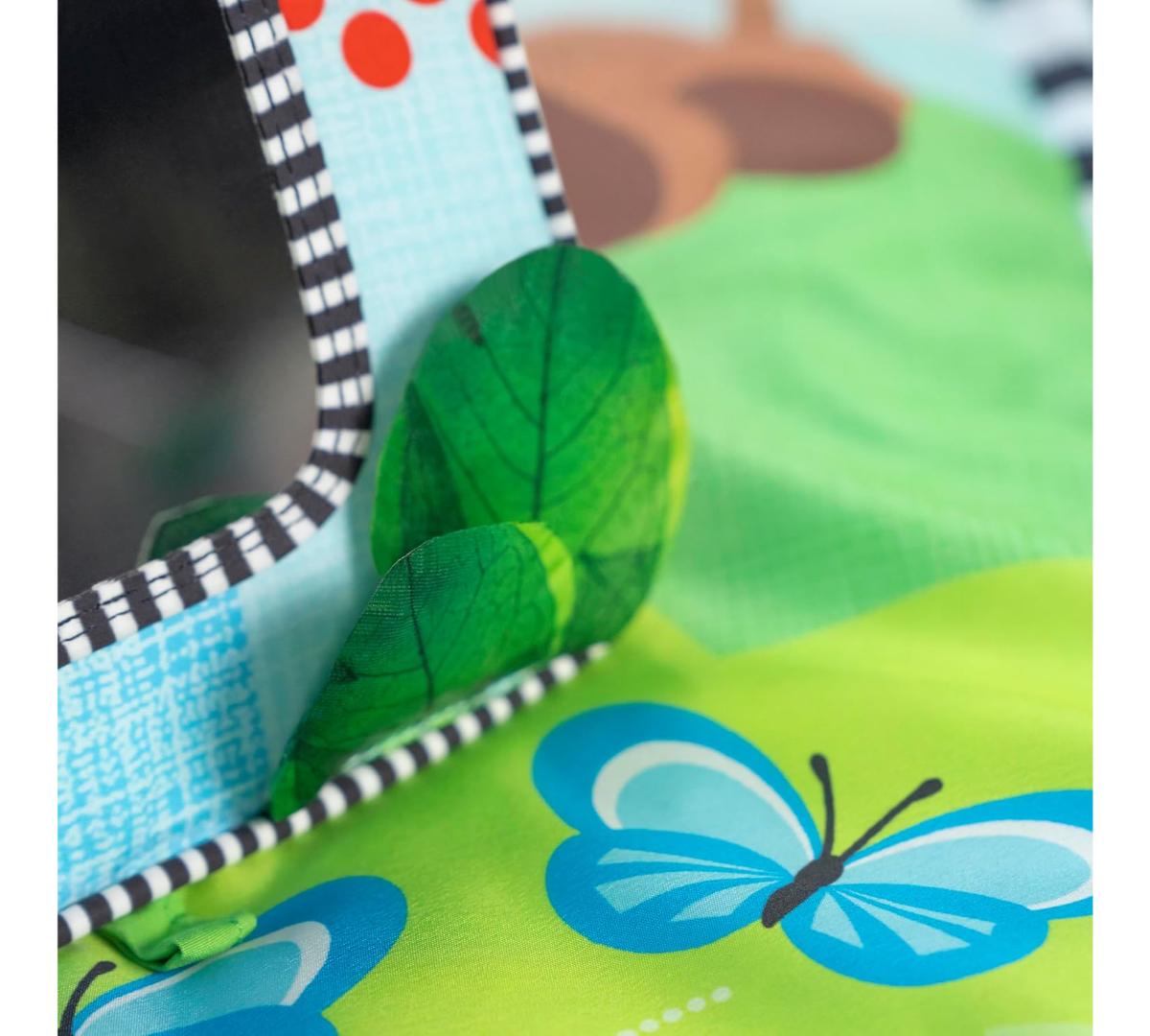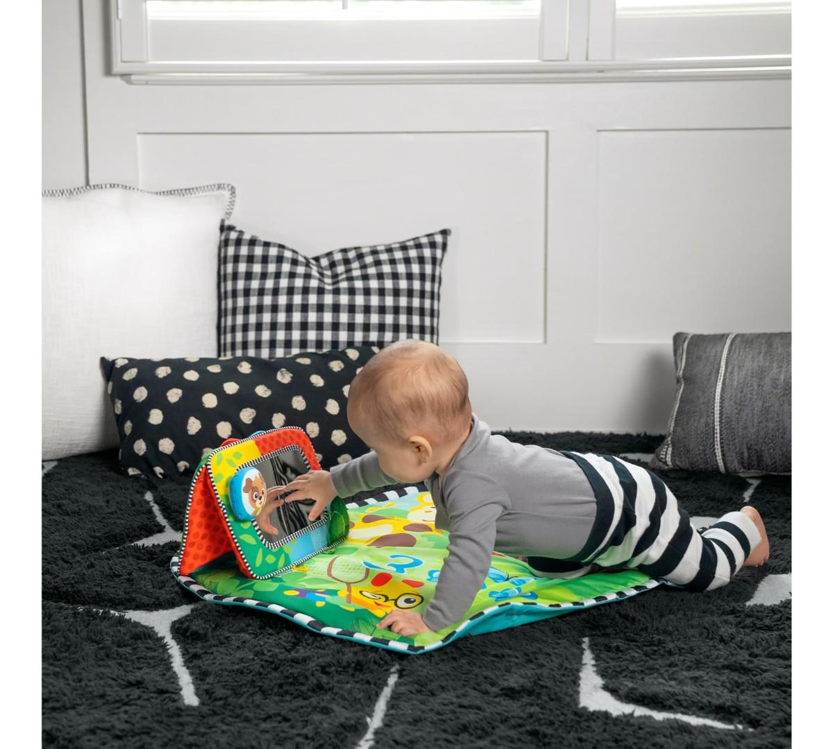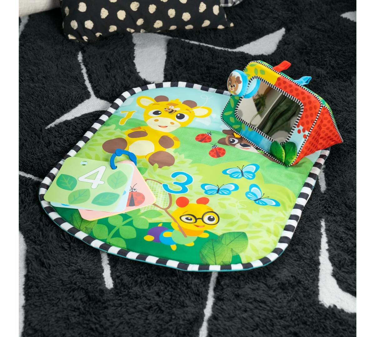 Explorá y aprendé en cualquier lugar con este set. Esta alfombra plegable ofrece 3 formas de juego: boca abajo, sentado o en movimiento. Incluye espejo seguro, texturas crujientes, chifle y colores vibrantes que estimulan los sentidos. Trae tarjetas educativas enlazables para aprender números, colores y animales.