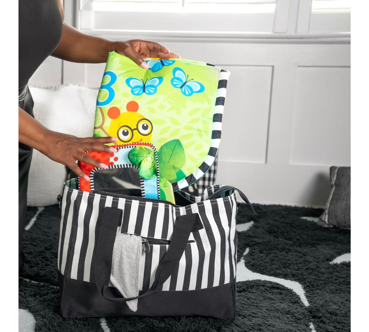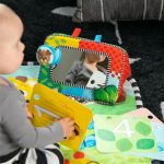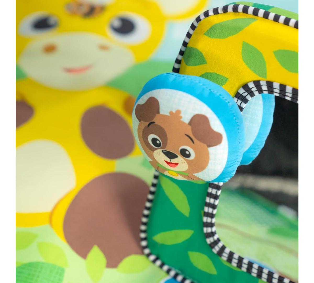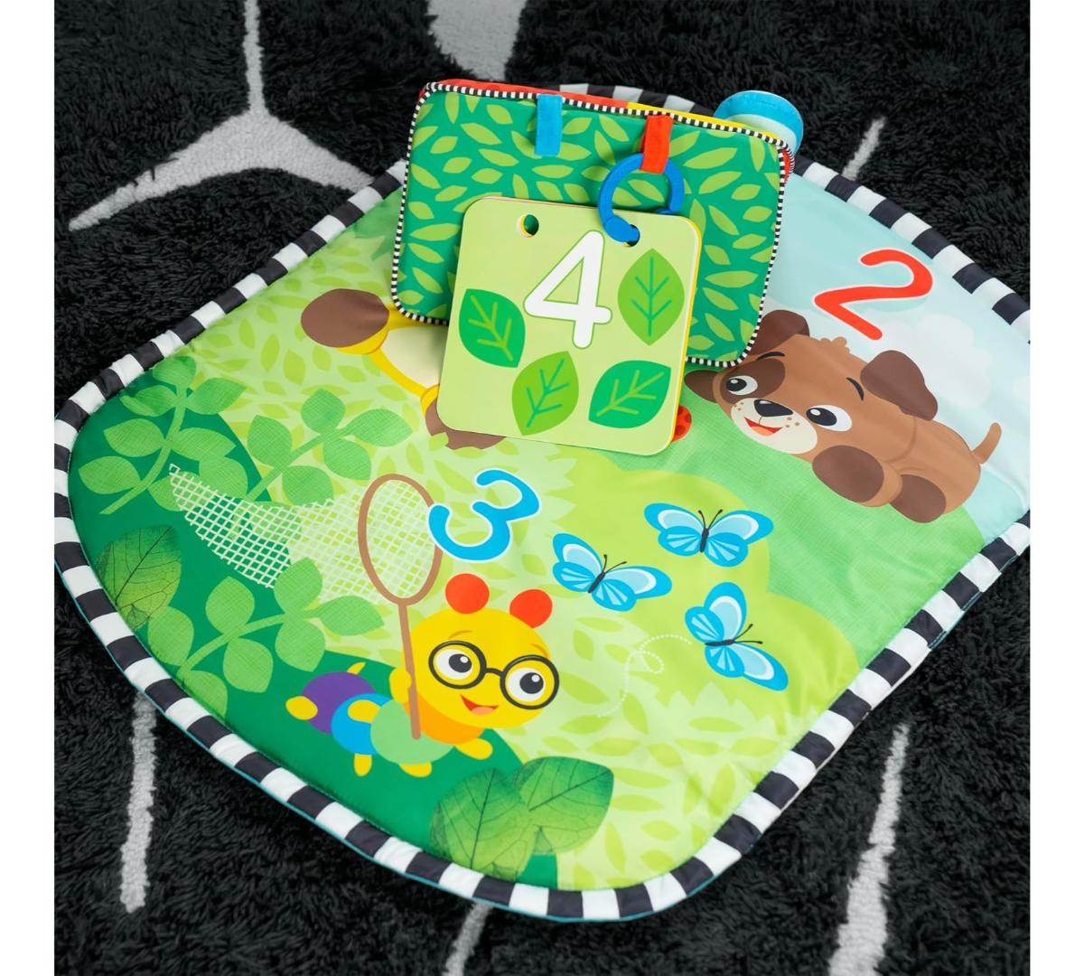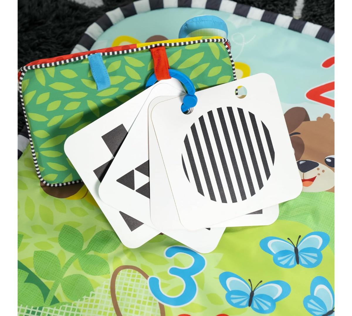 Explorá y aprendé en cualquier lugar con este set. Esta alfombra plegable ofrece 3 formas de juego: boca abajo, sentado o en movimiento. Incluye espejo seguro, texturas crujientes, chifle y colores vibrantes que estimulan los sentidos. Trae tarjetas educativas enlazables para aprender números, colores y animales.