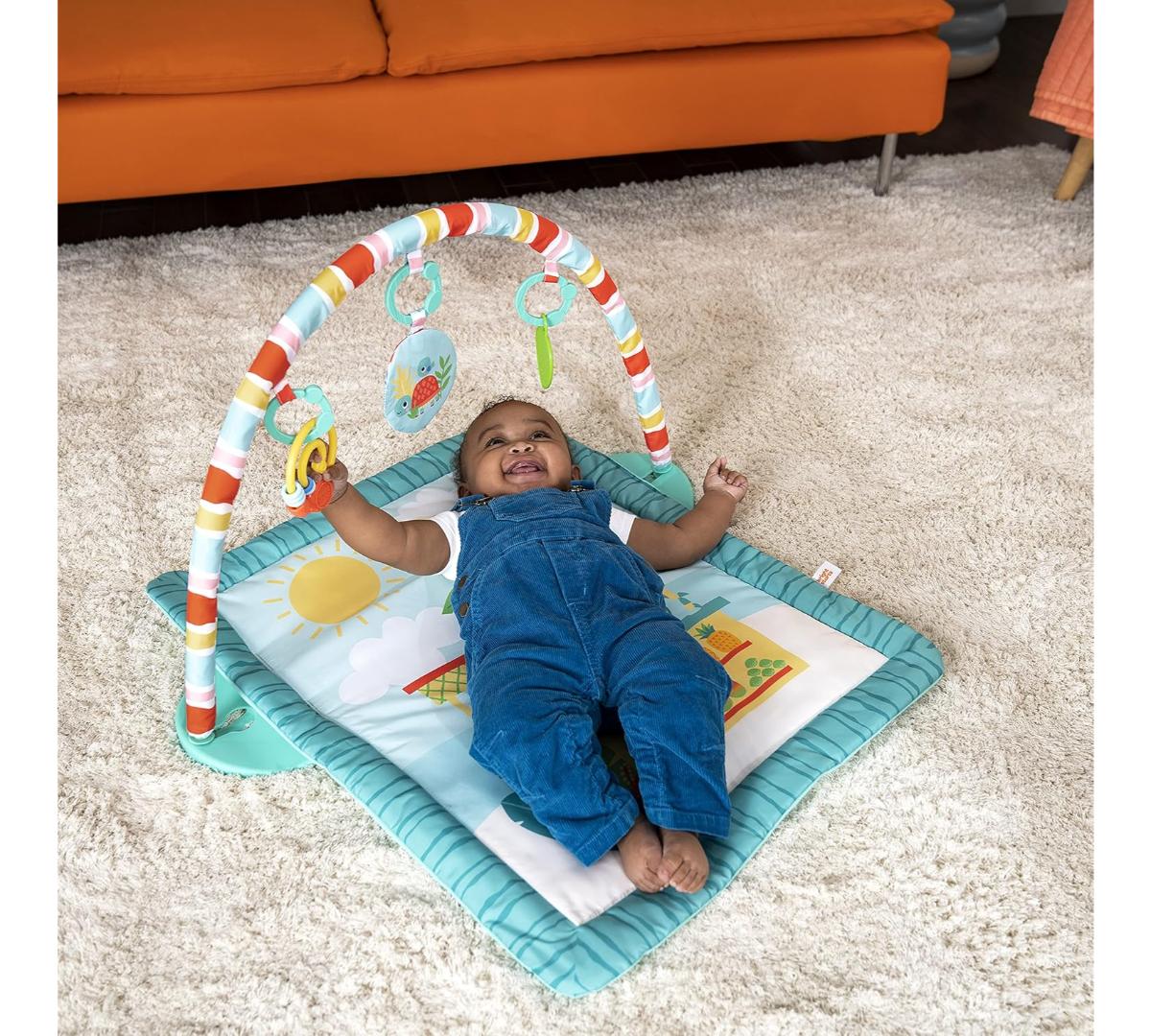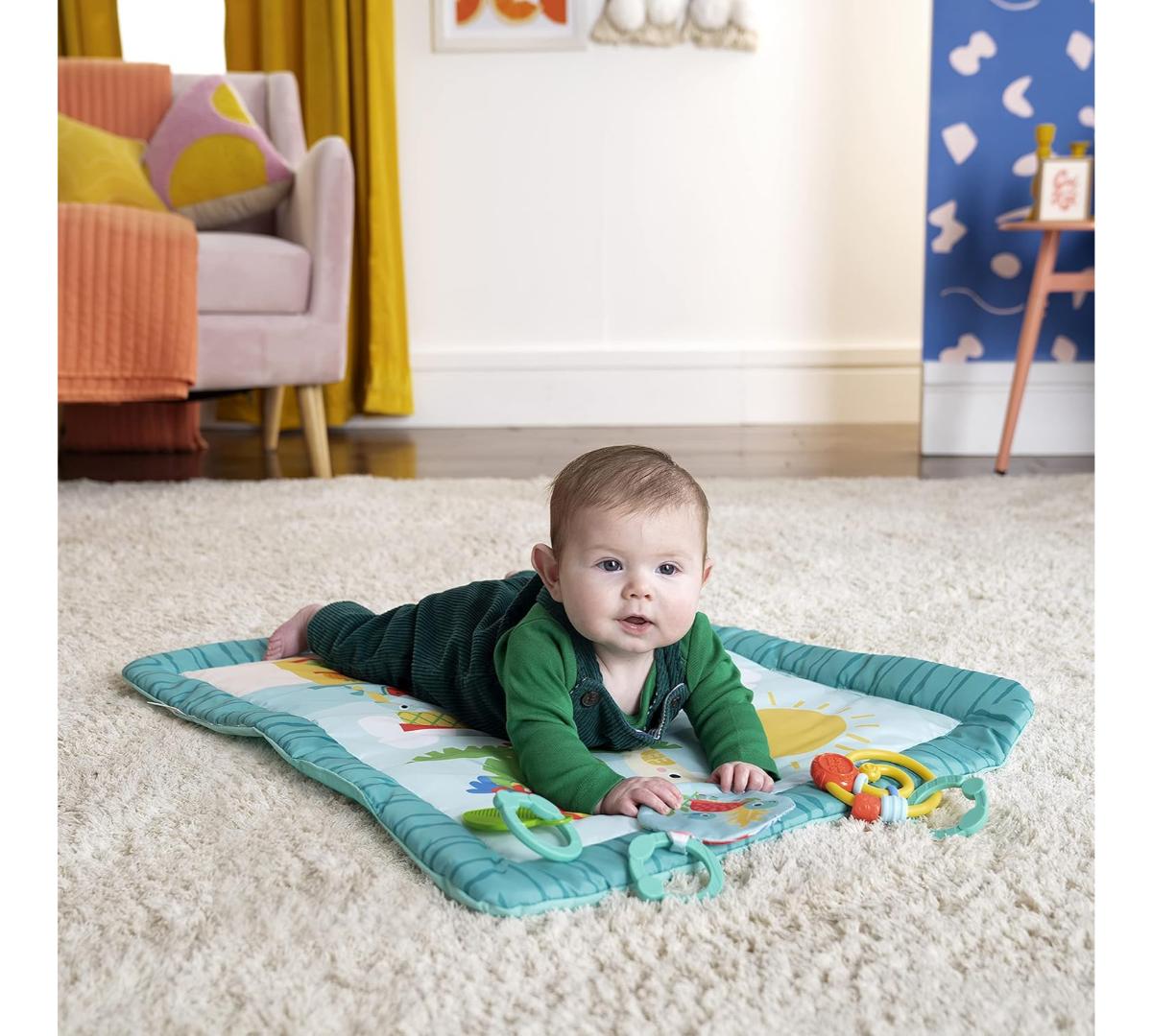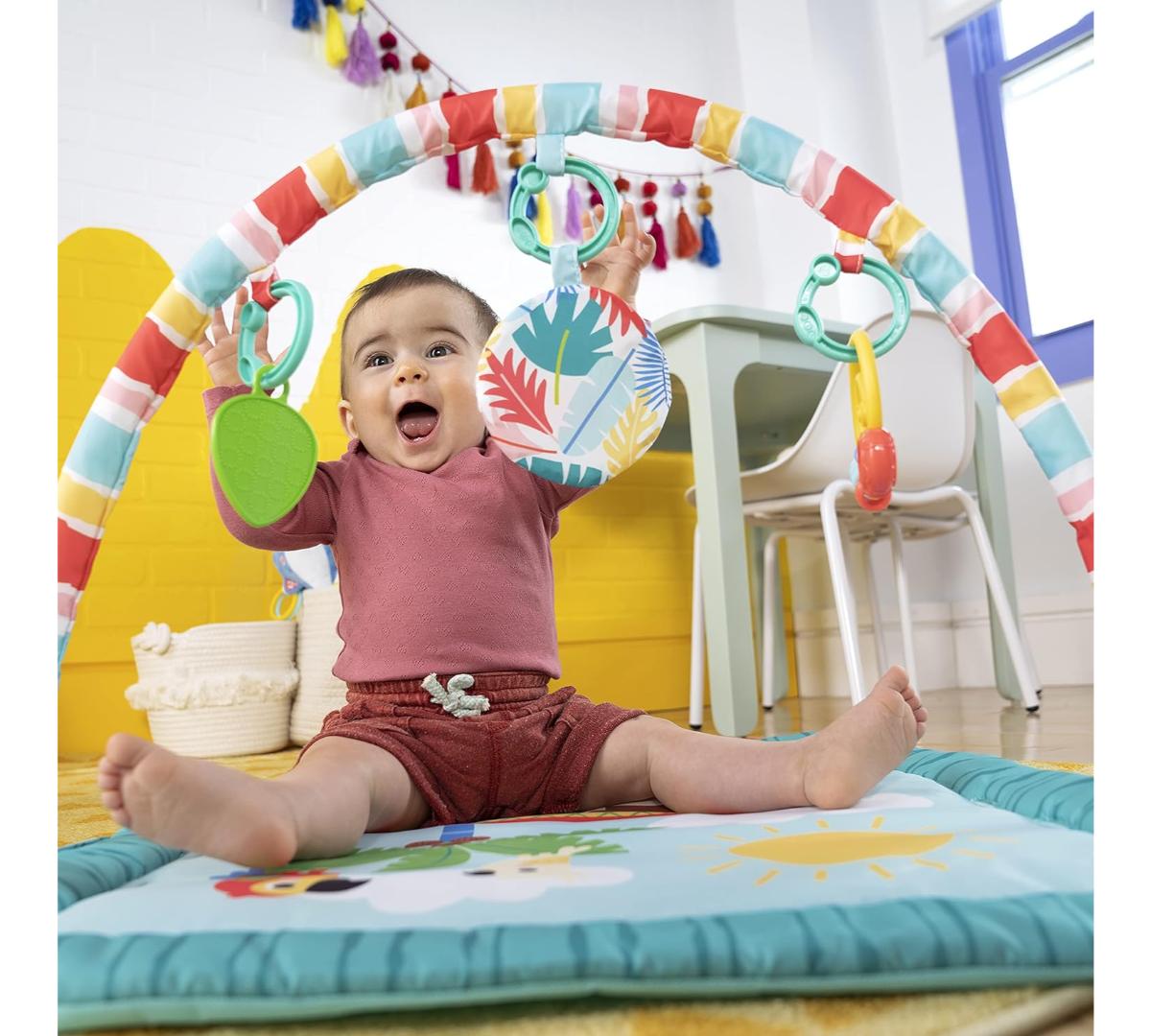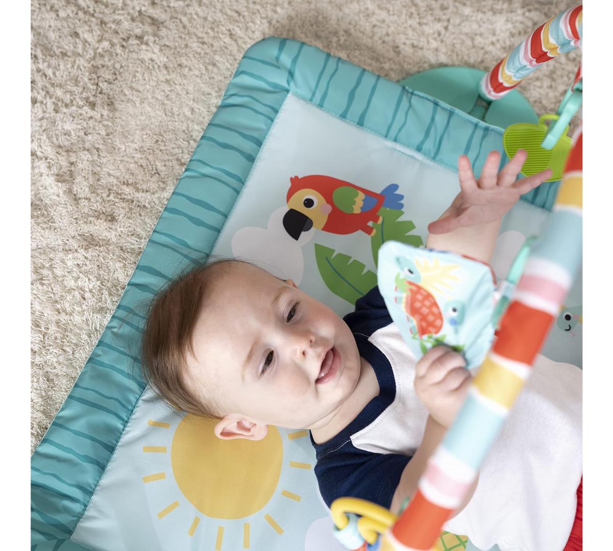 El tiempo boca abajo se vuelve unas mini vacaciones con este gimnasio de actividades. Ofrece 3 formas de juego: boca abajo, acostado o sentado, acompañando cada etapa del crecimiento. Incluye barra desmontable con juguetes colgantes que estimulan el alcance y la motricidad fina. Los juguetes con texturas, sonidos crujientes y cuentas invitan a explorar y jugar.