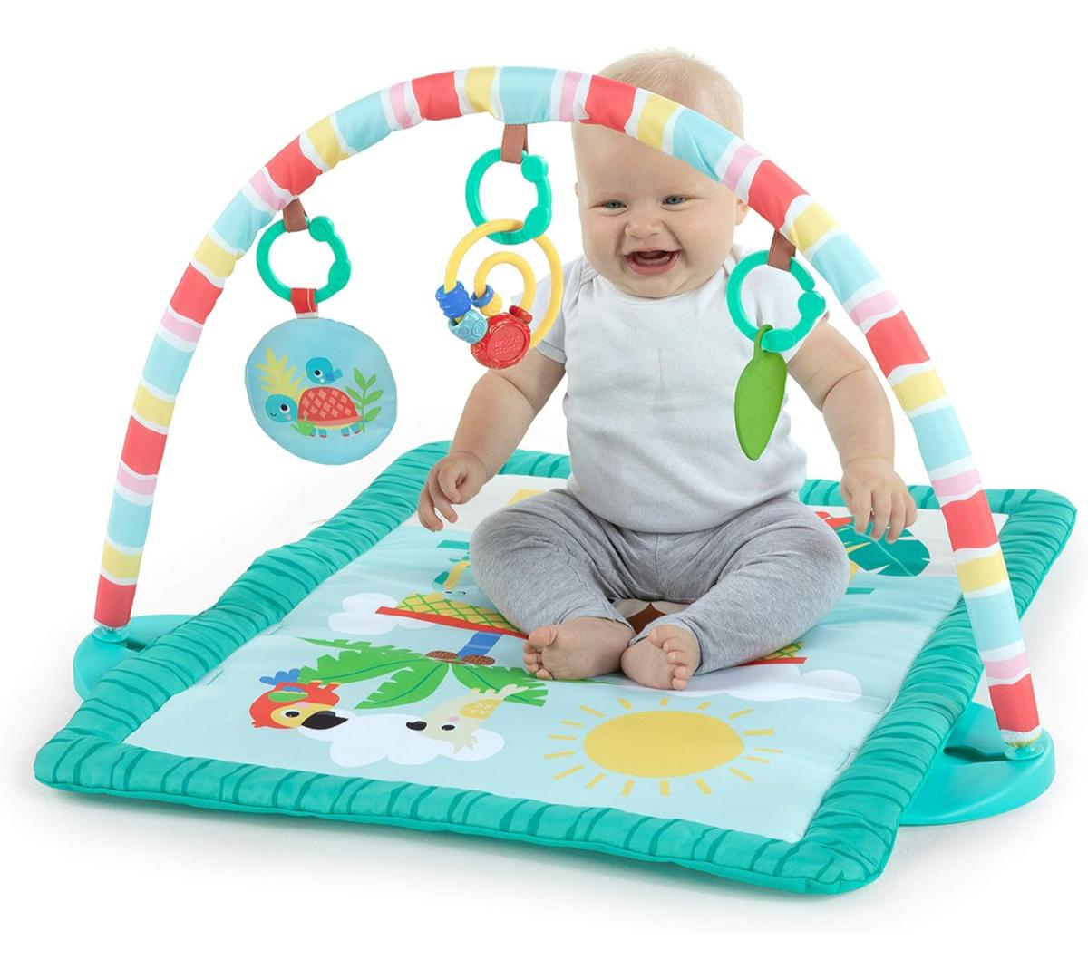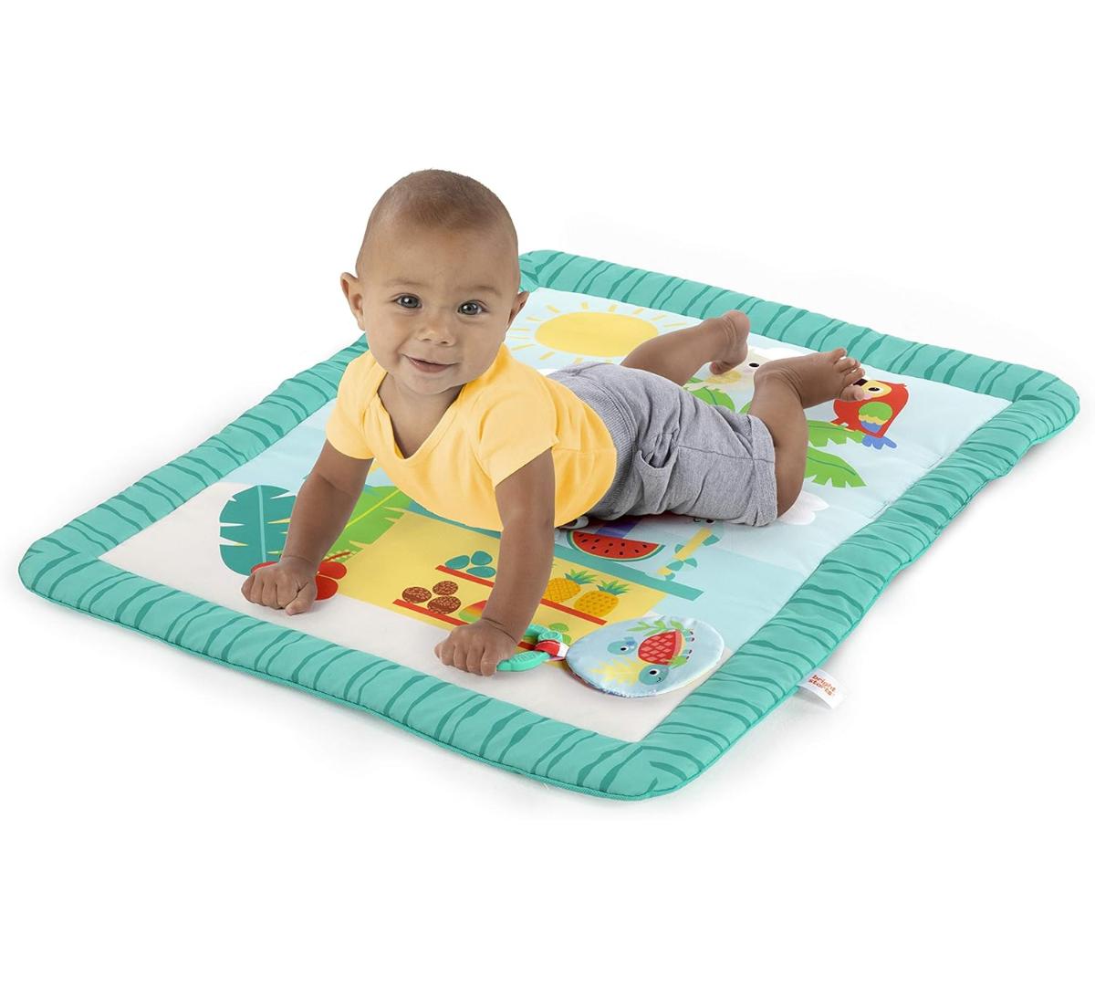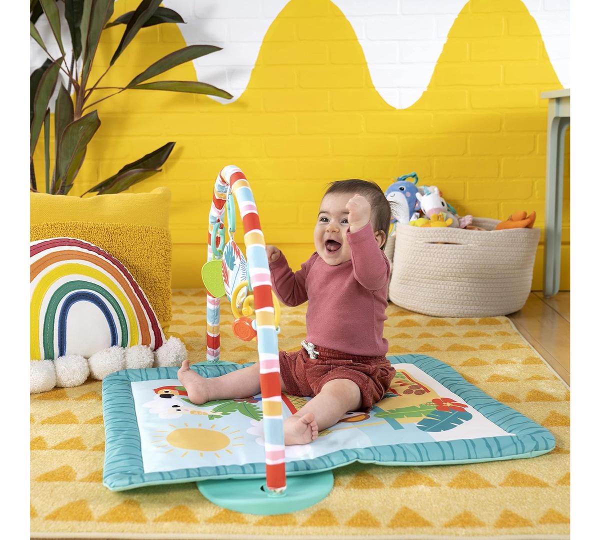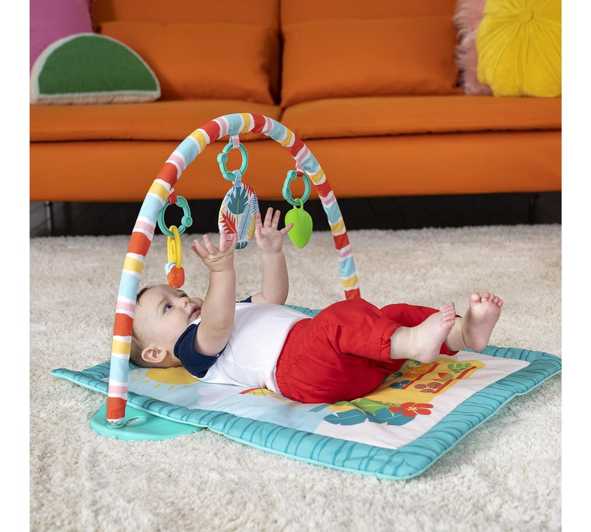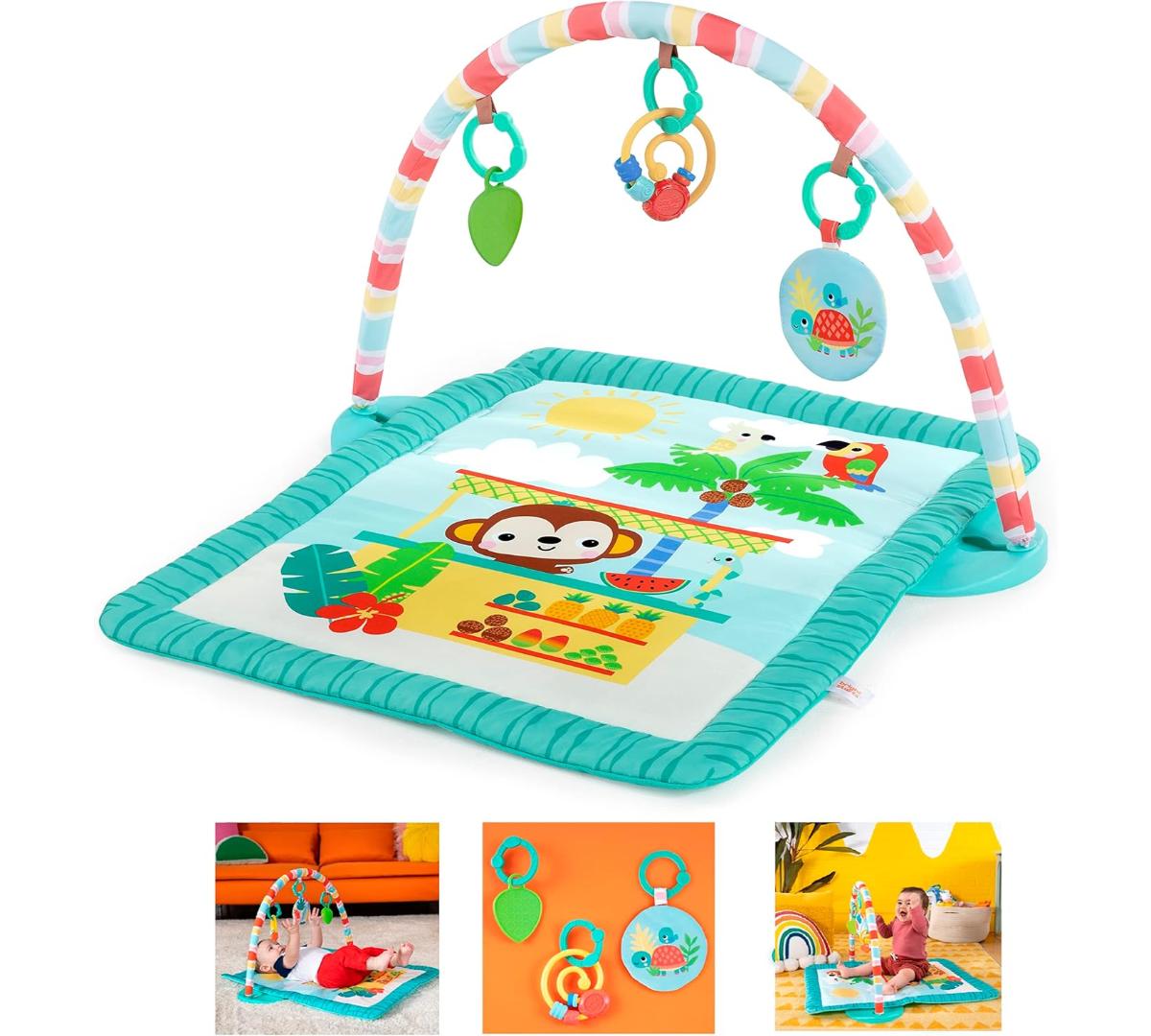 El tiempo boca abajo se vuelve unas mini vacaciones con este gimnasio de actividades. Ofrece 3 formas de juego: boca abajo, acostado o sentado, acompañando cada etapa del crecimiento. Incluye barra desmontable con juguetes colgantes que estimulan el alcance y la motricidad fina. Los juguetes con texturas, sonidos crujientes y cuentas invitan a explorar y jugar.
