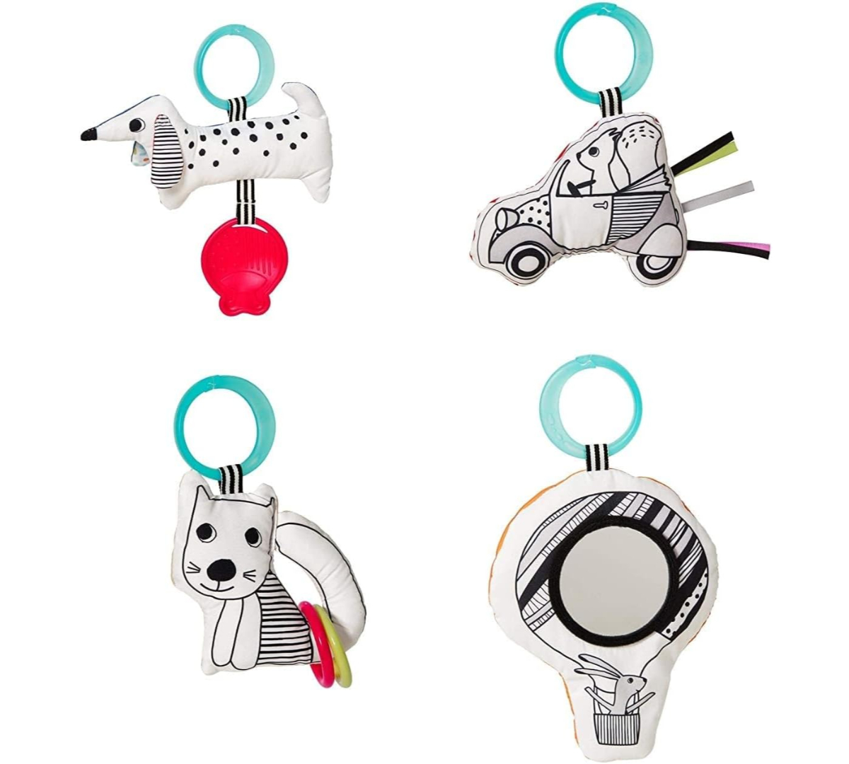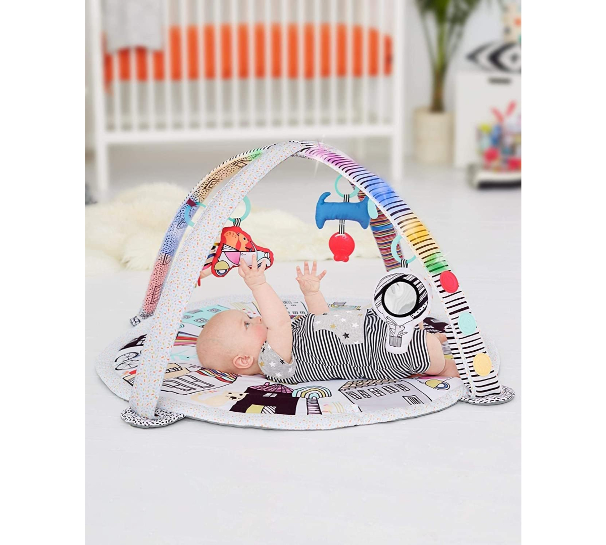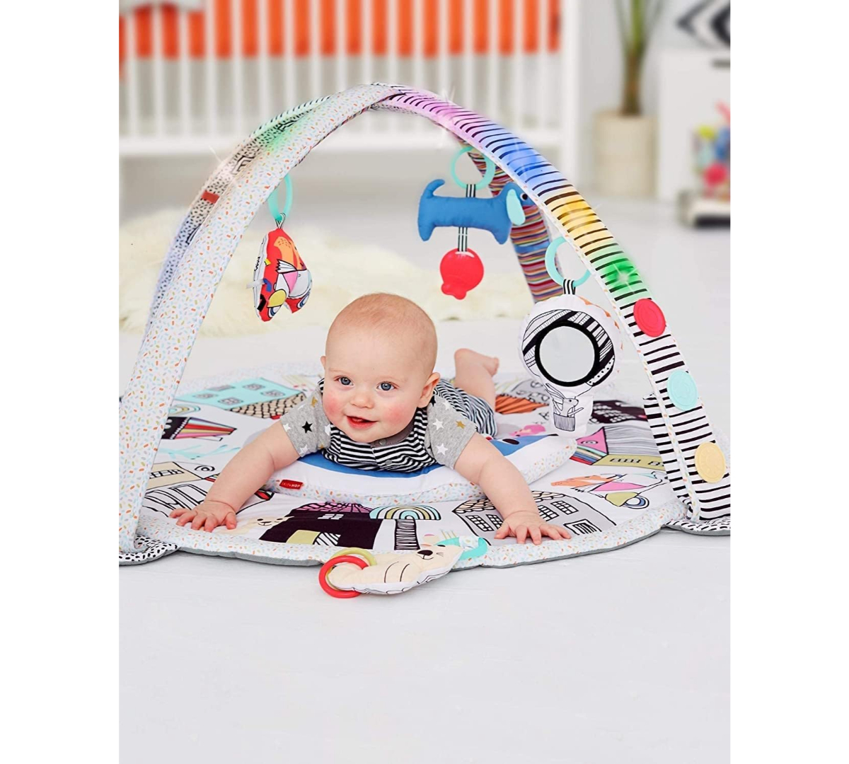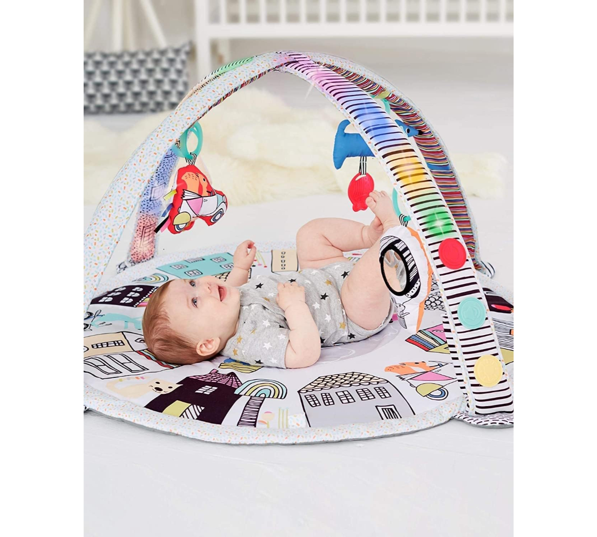 Estimula el desarrollo visual temprano de tu bebé con el gimnasio interactivo con luces y música. Sus patrones en blanco y negro con toques de color vibrante ayudan a despertar la vista desde los primeros meses, mientras sus arcos musicales con luces y sonidos convierten el juego en una experiencia multisensorial. Ofrece 3 modos de uso: juego acostado, boca abajo o sobre la alfombra, e incluye más de 17 actividades de estimulación, como juguetes colgantes reversibles, espejo seguro, sonajeros y mordillo.
