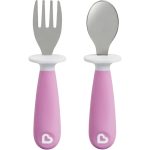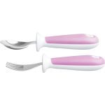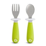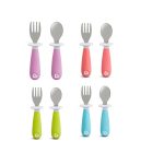 Incluye: (1) tenedor y (1) cuchara -La base mantiene las puntas de los utensilios fuera de las mesas y otras superficies, lejos de los gérmenes -El diseño ergonómico se adapta a las manos de los niños pequeños Los cubiertos recogen la comida con facilidad. Sin BPA, estante superior apto para lavavajillas. 12+ meses