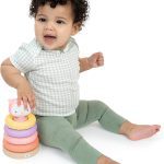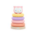 Cubierto con laadorable buhita Nally, Cutie Stacks viene con un soporte de madera sintética y 4 anillos coloridos, livianos y sin BPA con múltiples texturas que son fáciles de sostener y apilar para el bebé.