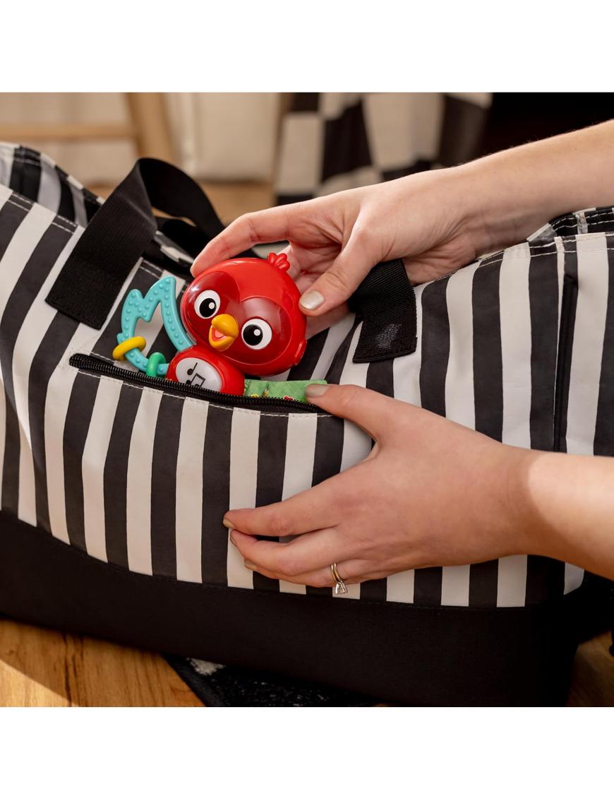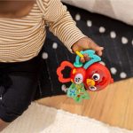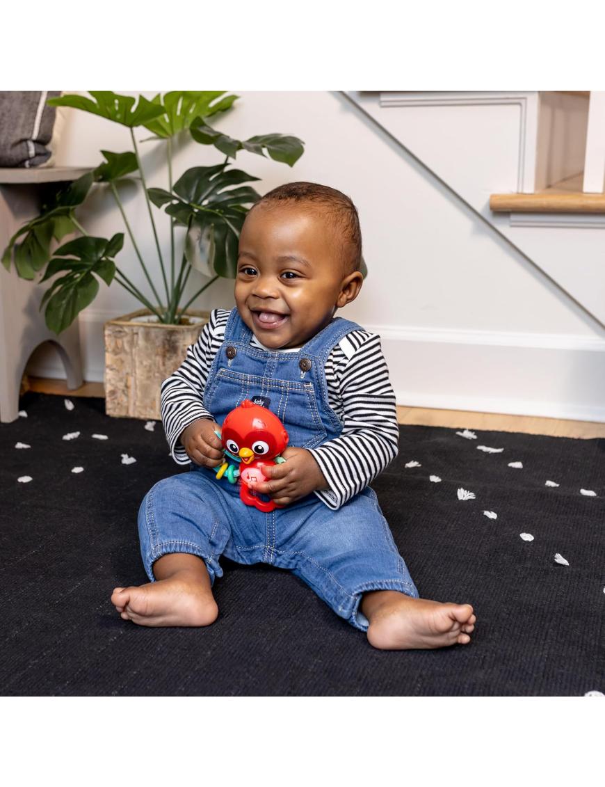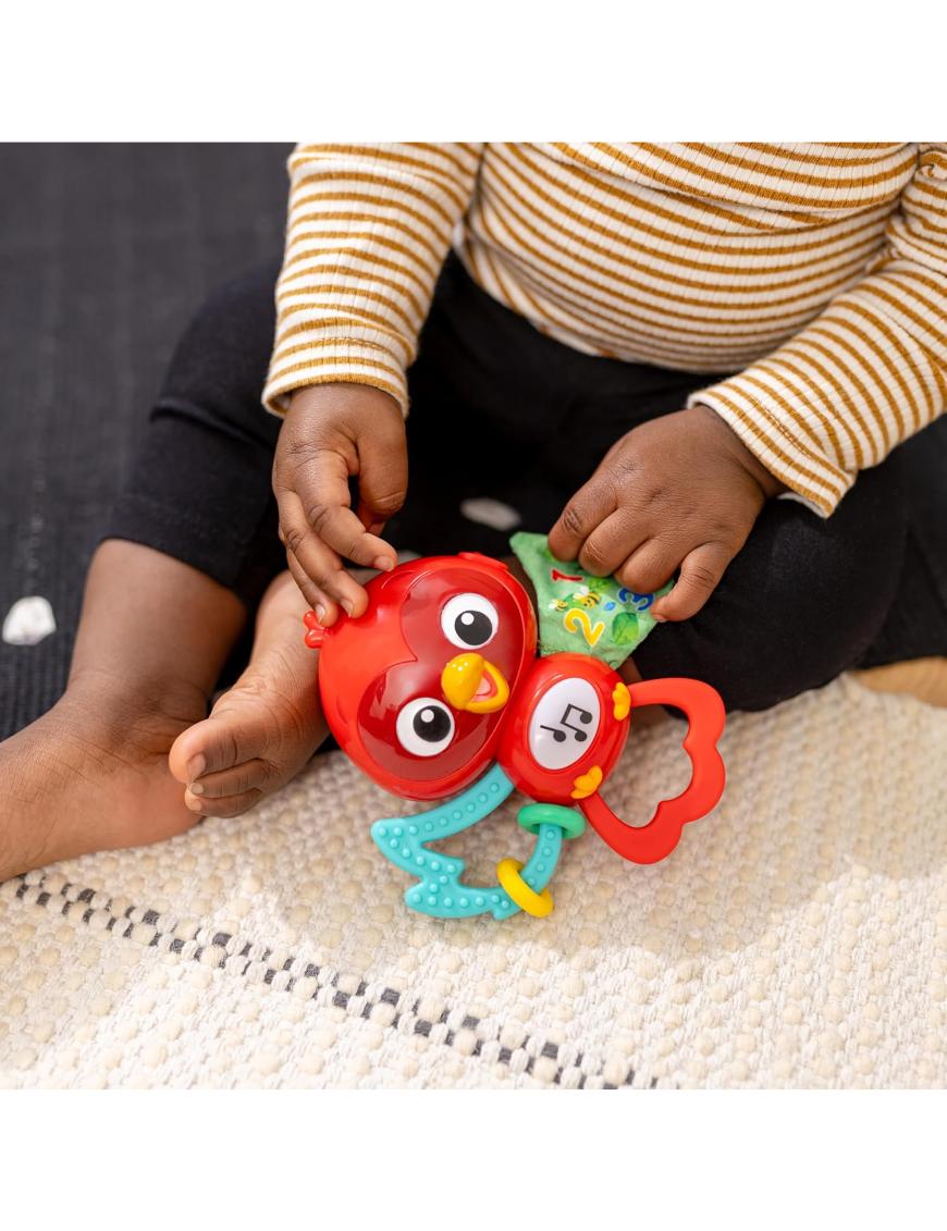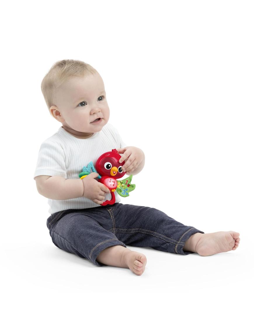Este juguete portátil combina luces, melodías clásicas y sonidos de aves para estimular los sentidos. Al presionar el botón central, Roxy se ilumina y reproduce más de 10 sonidos que enseñan causa–efecto. Incluye alas con texturas, números, colores y cuentas deslizables para desarrollar la motricidad fina.