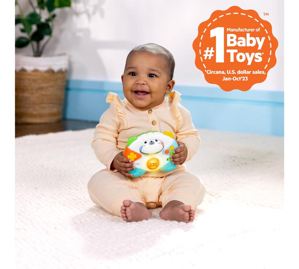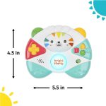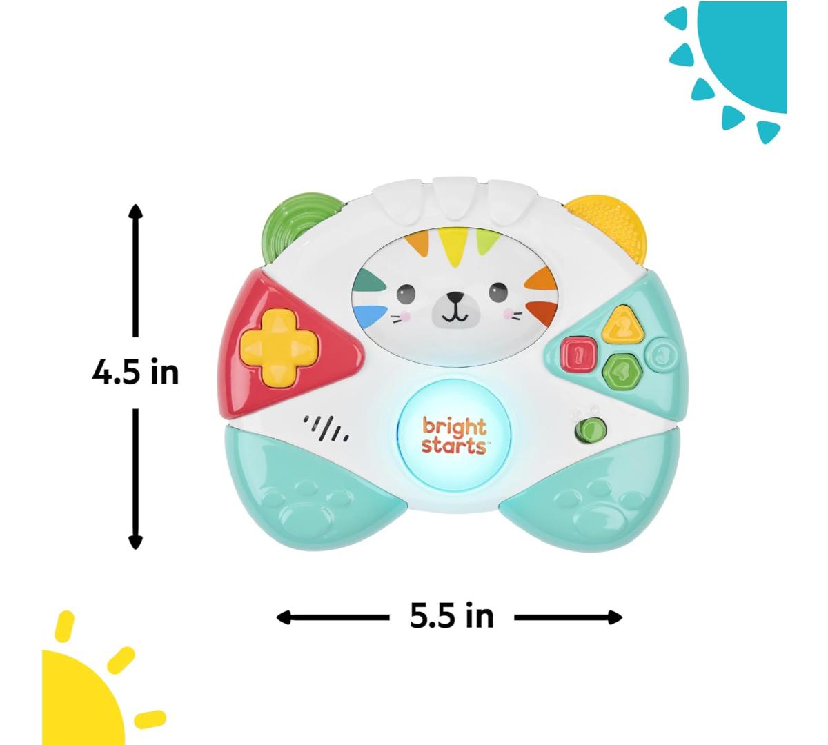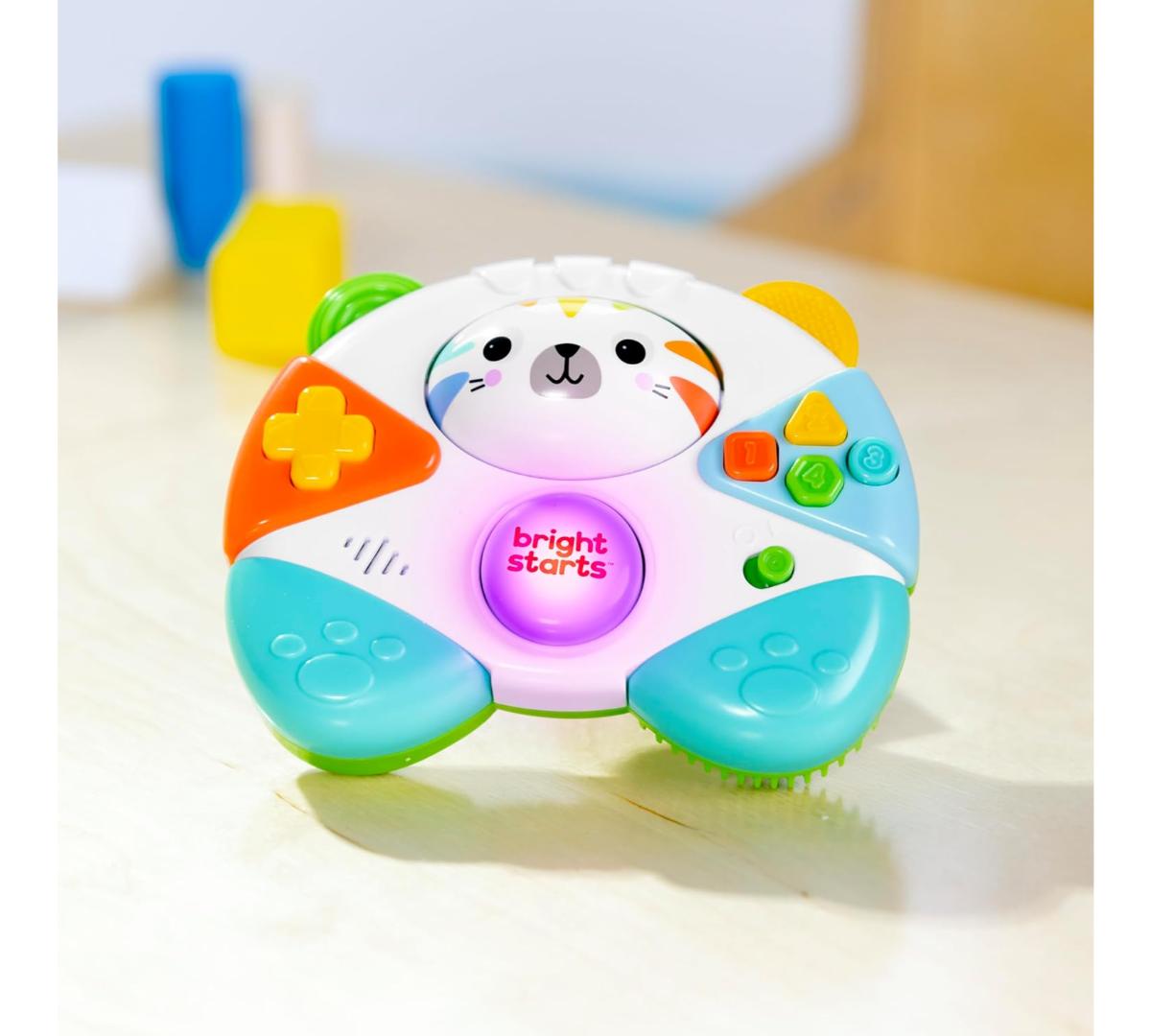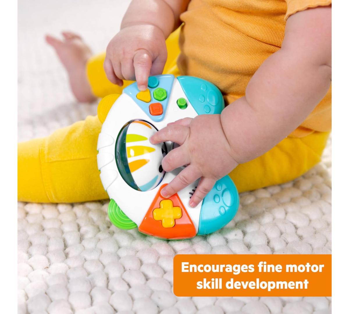 un control tipo videojuego pensado para manitos pequeñas. Incluye botones coloridos, pad direccional, luces y más de 20 sonidos y melodías que estimulan el juego interactivo. El rostro giratorio con sonajero y las orejitas con clics fomentan la curiosidad y la motricidad fina.