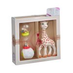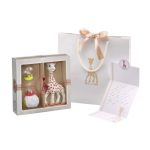 Este set de regalo bellamente presentado incluye una Sophie la girafe original y un suave sonajero de maracas que desarrolla los sentidos del bebé con sonido, color, textura y forma.