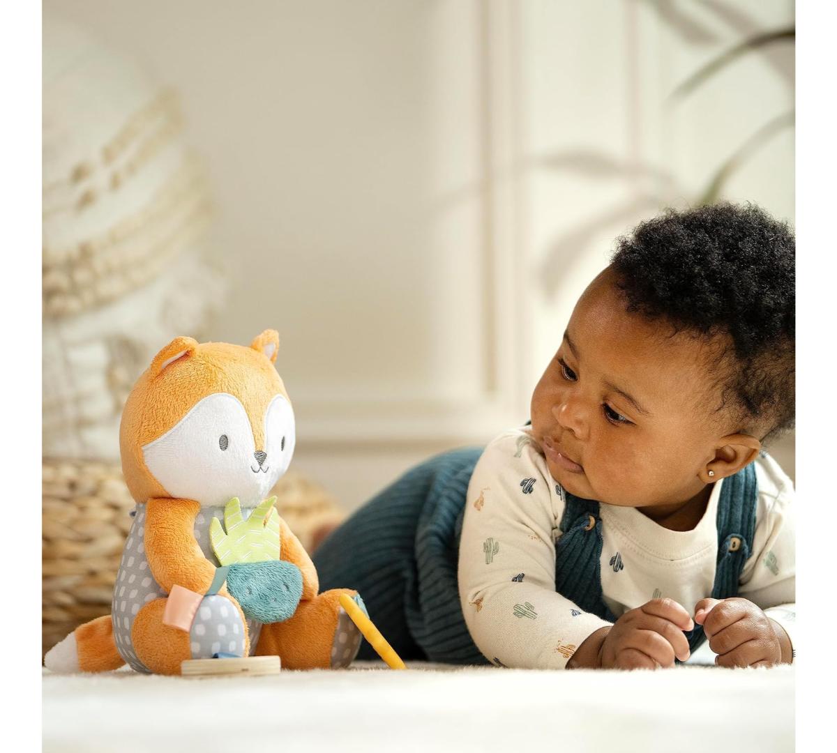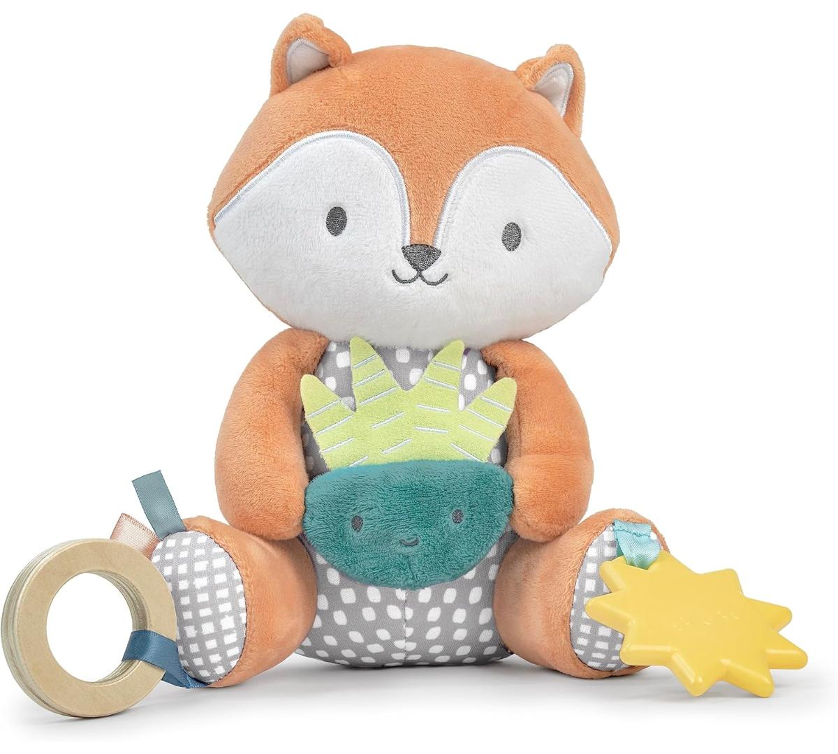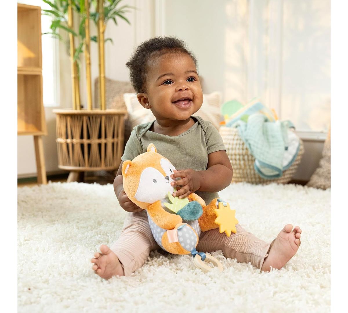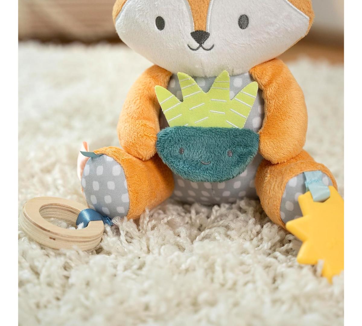 Conocé a Kitt, el tierno zorrito, ideal para acompañar al bebé en casa o de paseo. Suaves telas premium, texturas y sonidos crujientes estimulan los sentidos y la curiosidad. Incluye un mordillo con forma de sol, libre de BPA, que ayuda a aliviar las encías. Cuenta con una presilla de tela para colgar fácilmente del cochecito o portabebé.