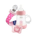 Un regalo perfecto para recién nacidos: biberón, chupete y clic sujeta chupetes a juego.